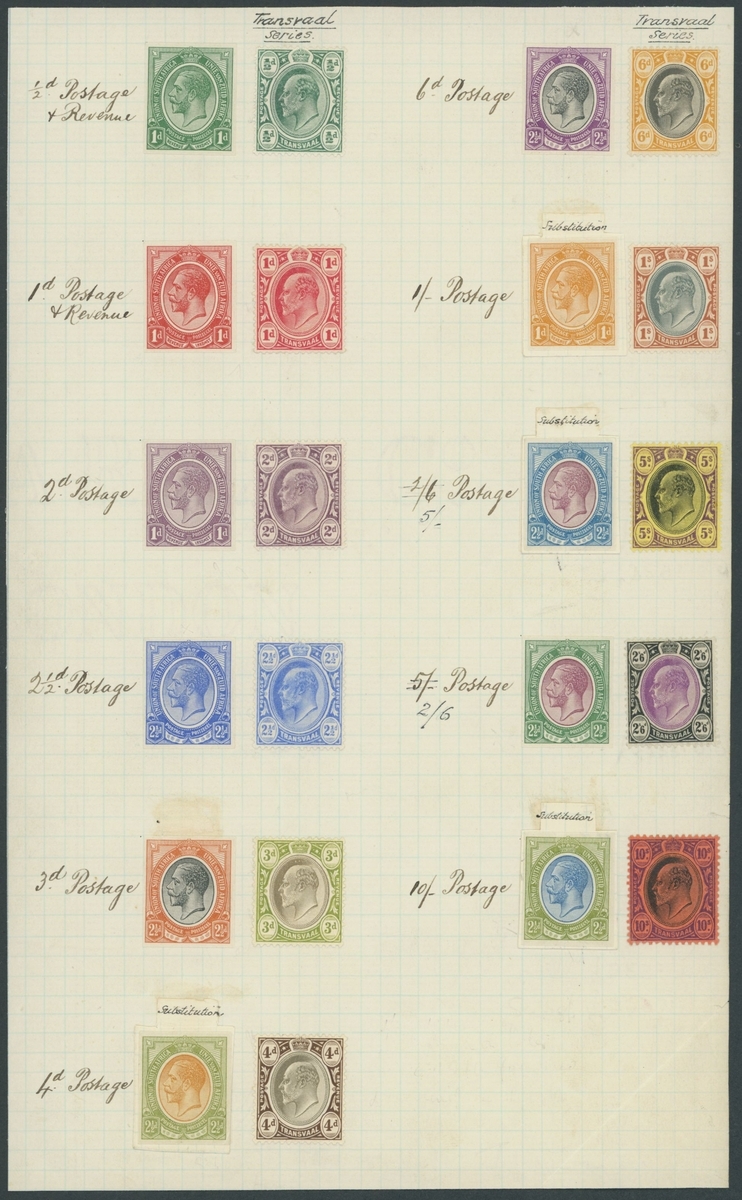 'Appendix A' sheet bearing eleven imperforate colour trials in the chosen colours of the 1d. through to 10/- with the previous Transvaal issues attached alongside so as to compare the colours, four are 1d. colour trials and the remainder 2½d., the 1/- annotated 'Substitution' and 2/6d. and 5/- crossed out and colour combinations swapped; fine and rare