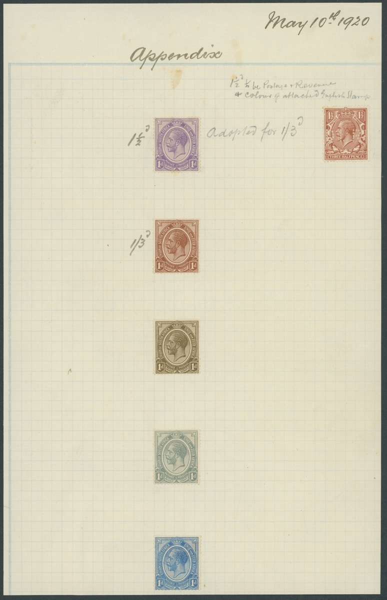 1920 (10 May) sheet bearing five perforated 1d. colour trials in violet, chestnut, brown, grey and blue showing the colours chosen for the 1½d. and 1/3d. reversed and alongside the violet colour trial an annotation 'adopted for 1/3d.' and a perfin example of the Great Britain 1½d. equivalent affixed and annotated '1½d. to be Postage & Revenue & colour of attached English stamp' alongside; fine and rare