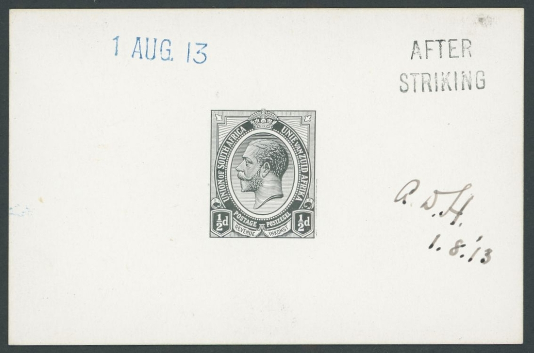 Die proof of the completed design in black on white glazed card (82 x 60mm.), marked