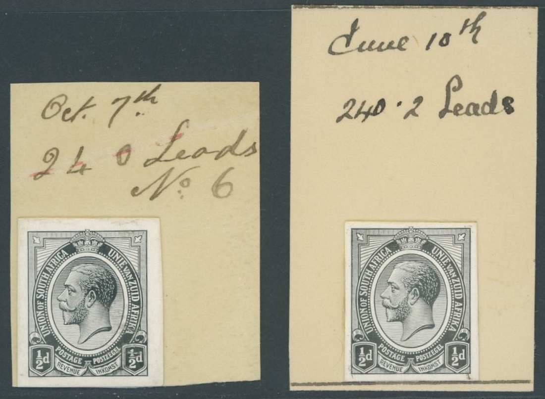 Two complete designs cut-down and affixed to pieces of De la Rue day book (2), the first marked 'June 10th/ 240 leads' and the second marked 'Oct 7th/ 240 leads' and 'No. 6' below; fine