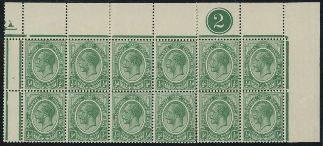 Plate 2 group of multiples (4) comprising corner strip of three, a corner block of six, upper right corner block of twelve with interpanneau margin at left and upper-left corner block of twelve with interpanneau margin at right; Plate 2 is the rarest plate, fine and rare multiples. S.G. 3 group