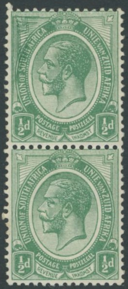 ½d. green vertical pair, the upper stamp variety doubly printed, the fifth example from the original strip of five bearing this error and the example below normally printed; this example has the least pronounced doubling showing just a partial double print at upper left; a fine and hugely rare variety. Brandon Certificate (2004). S.G. 3a, £12,000