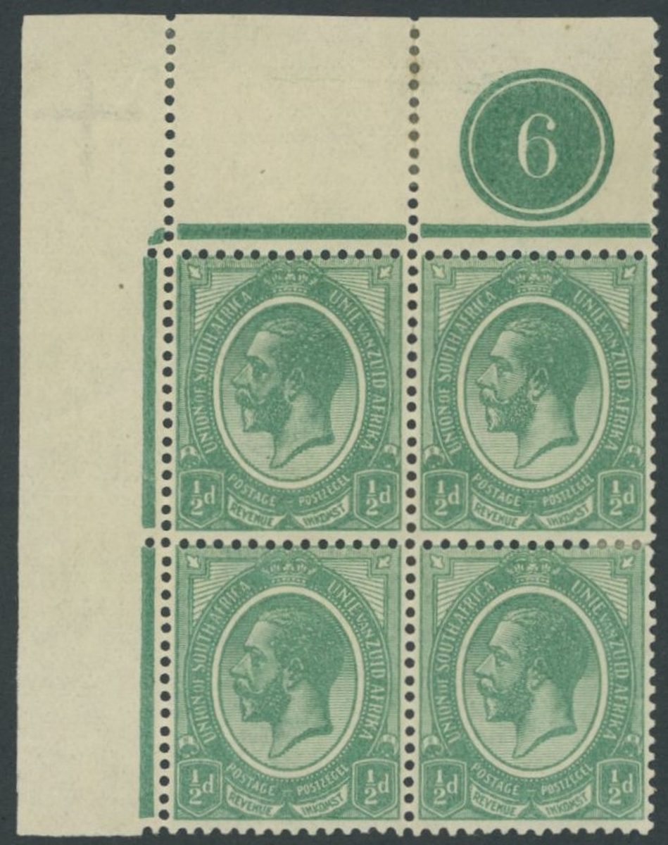½d. dark mossy green, upper-left corner block of four with plate number '6', some minor perf. reinforcement and some pencil notations in the margin on the reverse; large part original gum, fine and very rare. S.G. 3 var. SACC 2e