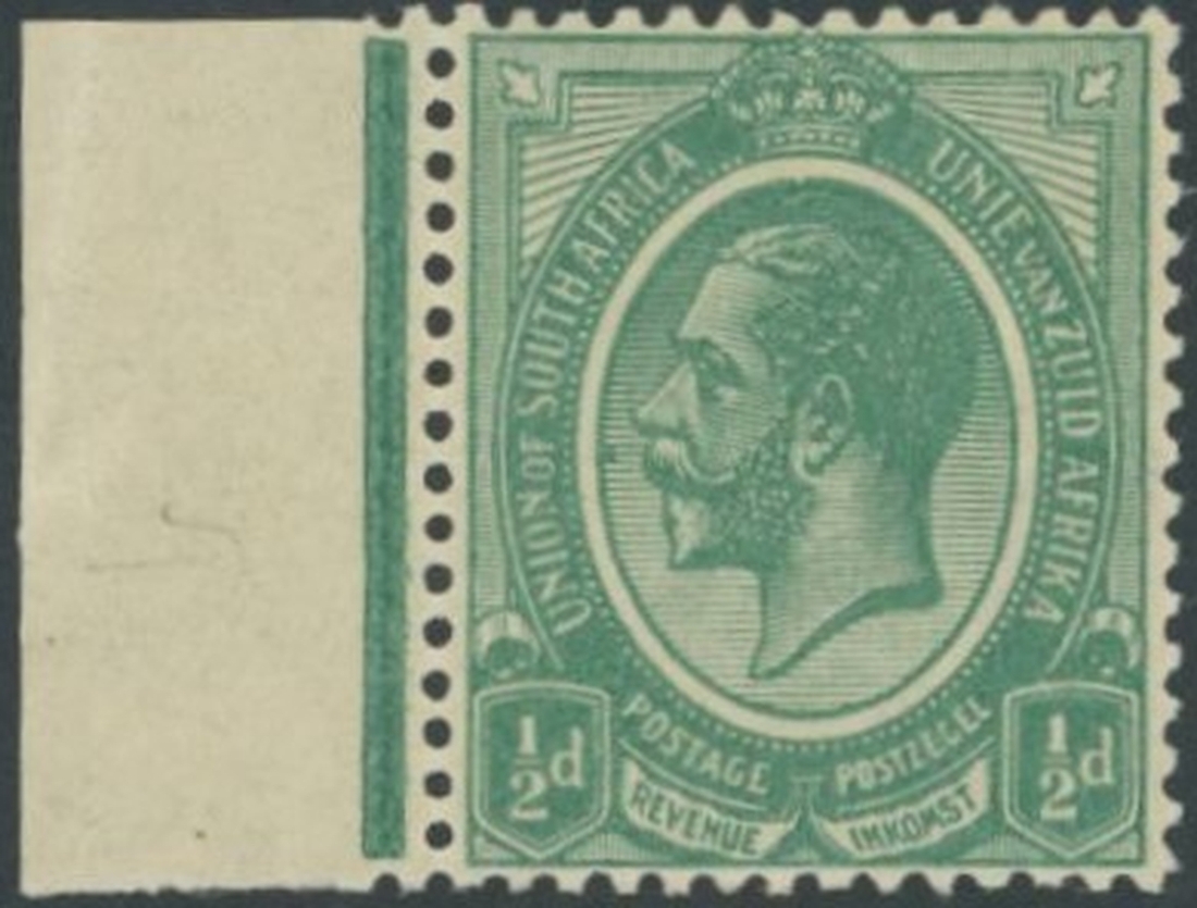 ½d. dark mossy green, marginal example from the left of the sheet; faint gum bend, unmounted mint; fine and rare. S.G. 3 var.; SACC 2e