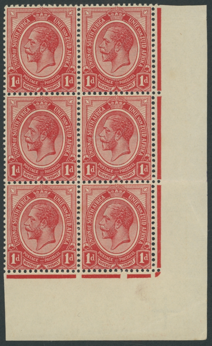 1d. rose-red, lower-left corner block of six from Plate 1a showing small square nick in Jubilee line; superb mint and very rare. Hagger 3Cb