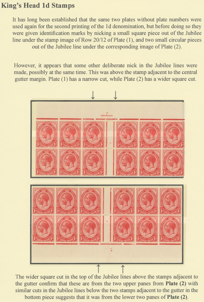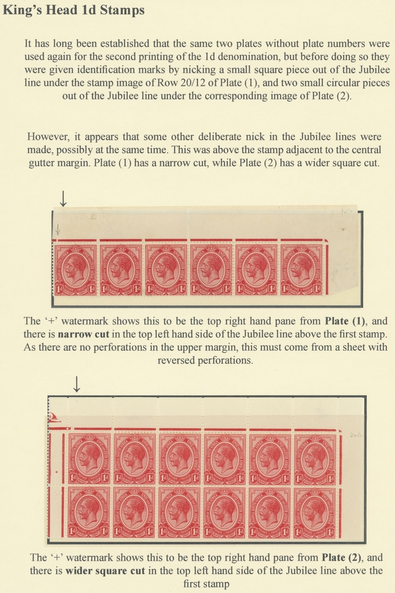 1d. rose-red, a group of multiples from Plates 1 and 2 without plate numbers (4) comprising upper right corner strip of six (Plate 1) showing narrow cut in the top left-hand side of the Jubilee line, upper right corner block of twelve (Plate 2) and upper and lower marginal interpanneau blocks of twelve with wide square cuts in the Jubilee lines; fine and rare