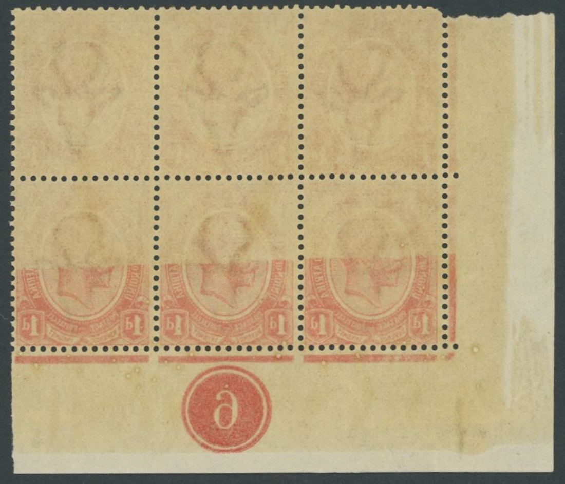 Two mint multiples, a Plate 4 corner block of eight partially printed at left due to a corner fold, resulting in a partial offset of '4' at lower left, the fold split separated on being opened out and has been rejoined; also a Plate 6 corner block of six from the lower left corner of the sheet with partial offset on the reverse; fine and striking errors (2)