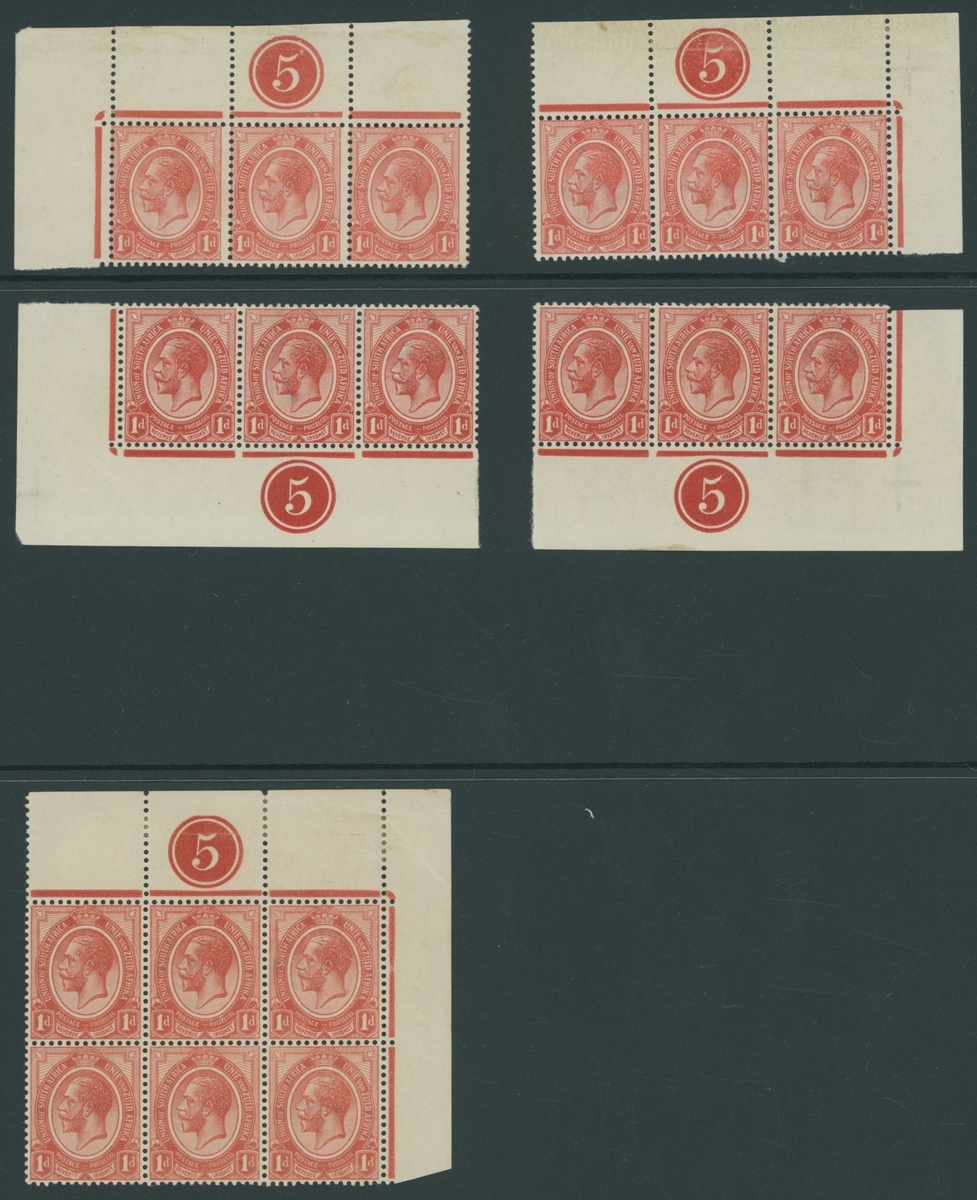 Plate 5 group of mint corner multiples (8) comprising horizontal strips of three (5) including one each from all corners of the sheet and three corner blocks of six, all from different corners of the sheet; fine mint multiples from this rare plate
