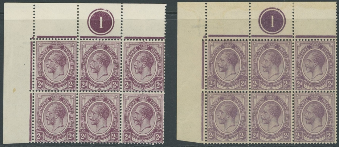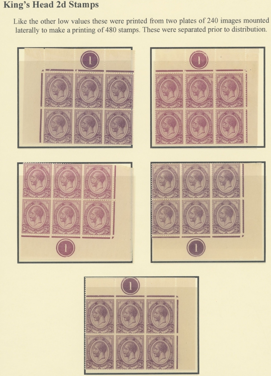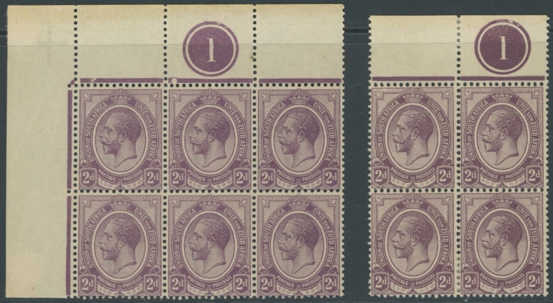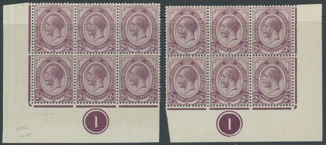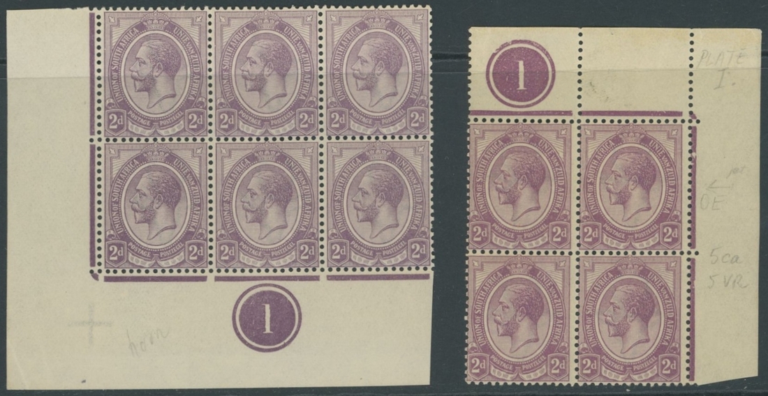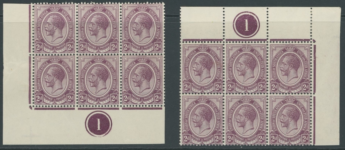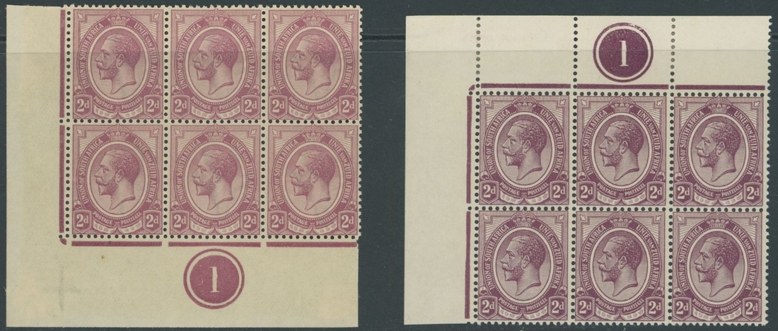 A group of Plate 1 and 2 multiples on pages including a range of singles, pairs, blocks of four and blocks of six from all corners of the sheet from Plate 1 along with a range of other blocks of four and six and Plate 2 including blocks of six from all corners of the sheet along with some other blocks; a fine group also showing a range of shades