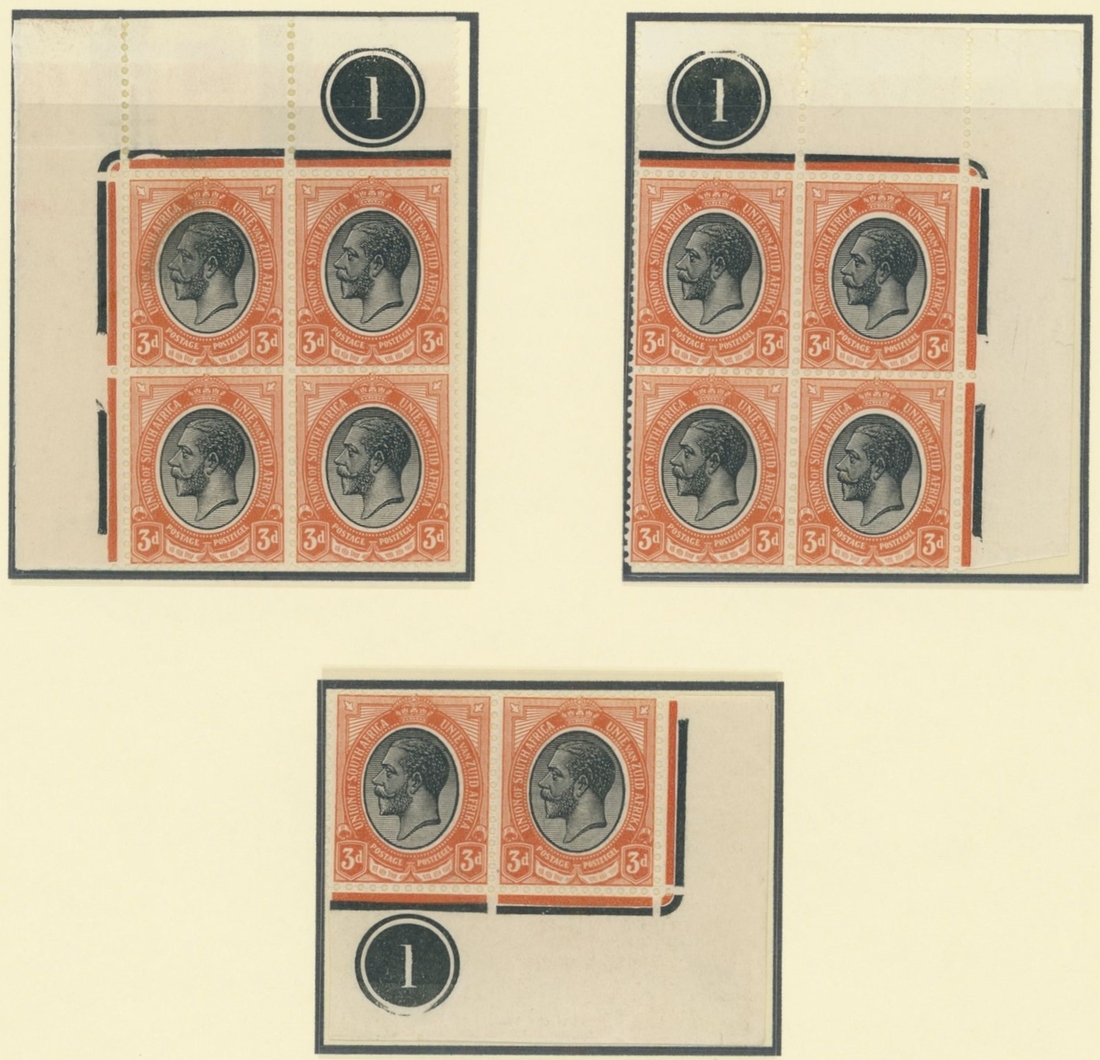3d. black and orange-red, upper left and right corner blocks of four and a lower right corner pair all with plate '1' and all with watermark inverted, very fine mint