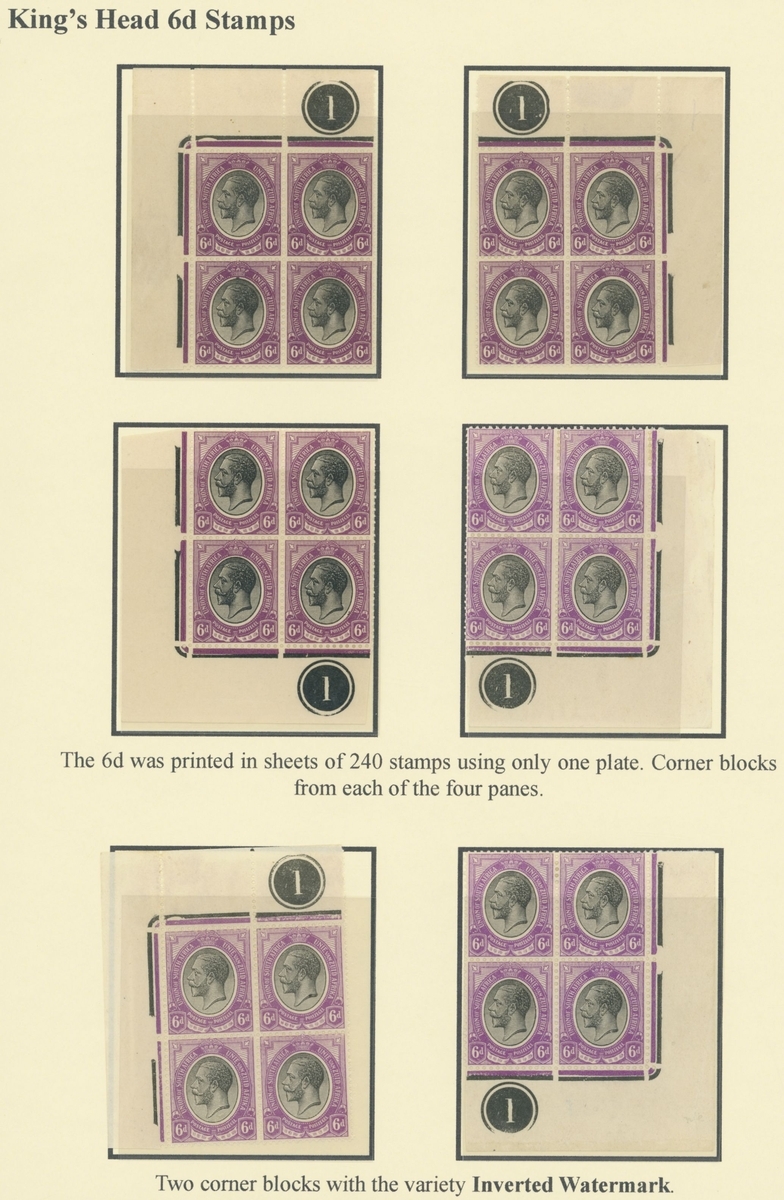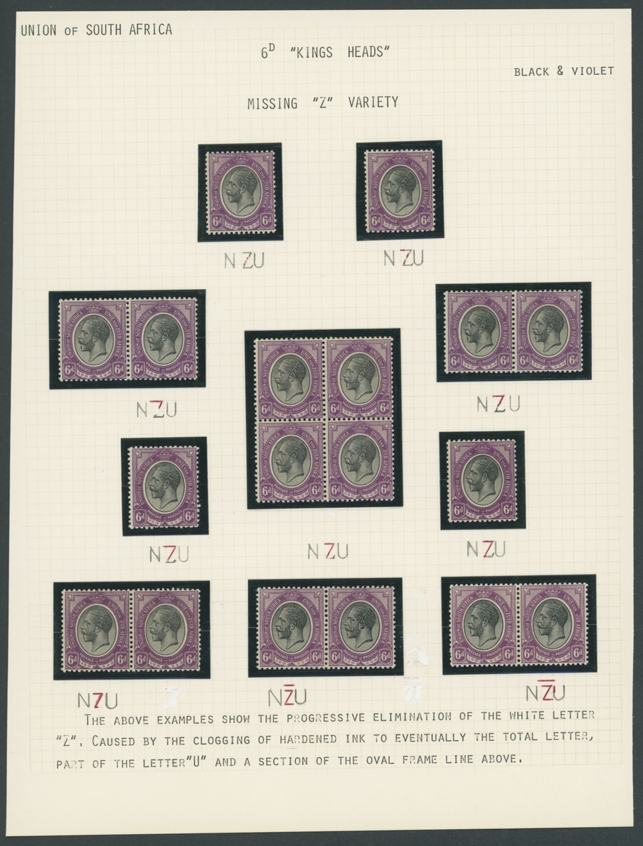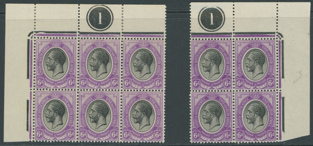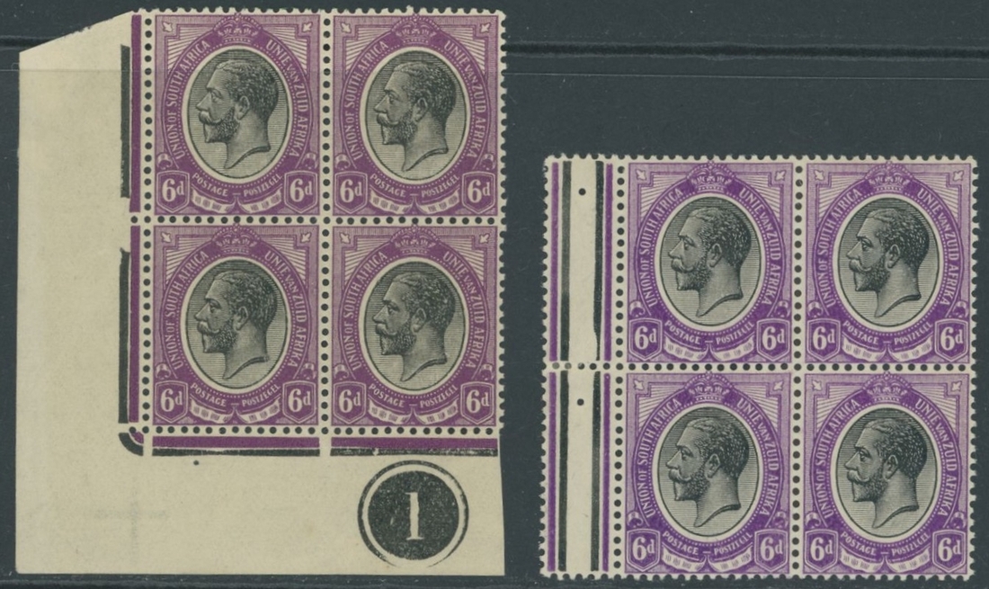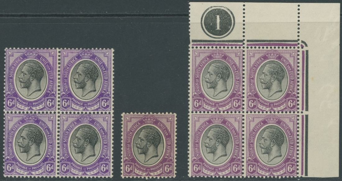 6d. black and violet group of mainly Plate number multiples (13) along with a range of single examples with minor varieties; comprising corner block of six, corner blocks of four (11) including two with watermark inverted, one block of four with missing horn in watermark, a block of four with pre-printing paper fold resulting in lighter print at upper right, a study of the missing