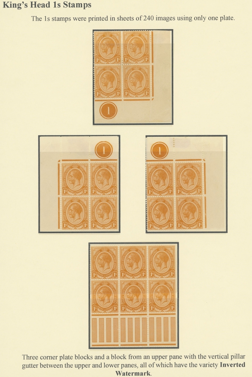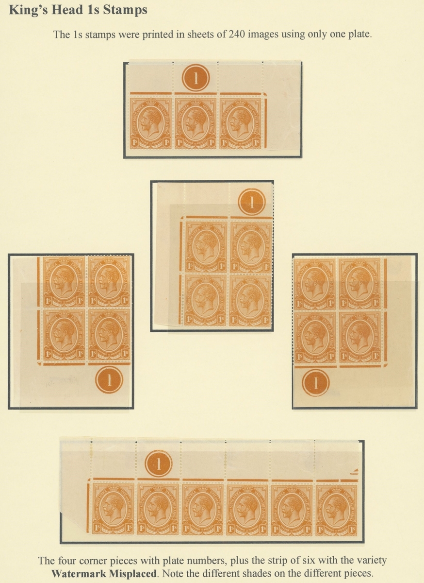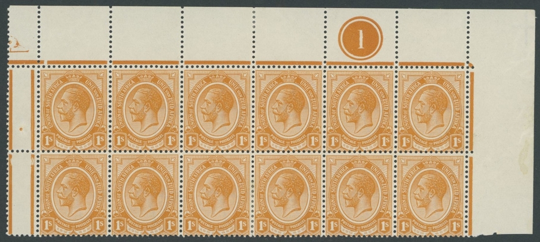 A group of mainly Plate number '1' multiples (19) including an upper marginal block of twelve, corner blocks of four (4) one from each corner of the sheet, strips of three and six all with watermark upright and corner pairs (2), blocks of four (9) and a block of six all with watermark inverted; also a single example with broken horn in watermark and a pair with missing horns in watermark; a fine group