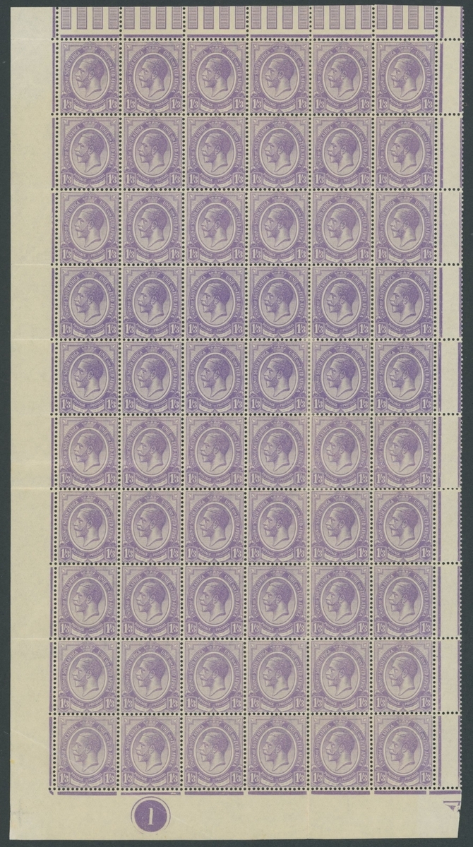 1/3d. violet, a lower-left corner pane of sixty with plate number '1' and margins on all sides; superb mint. S.G. 13, £540+