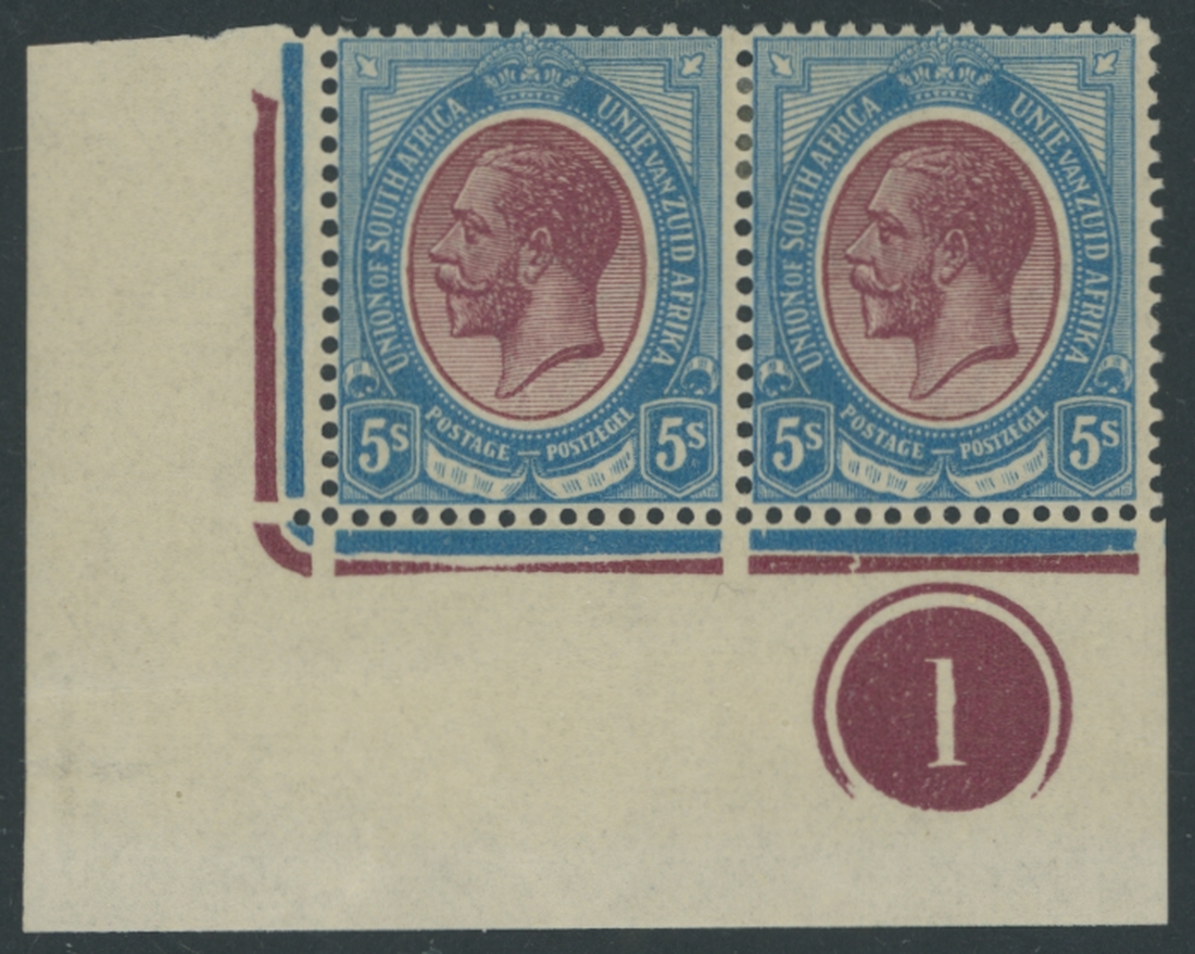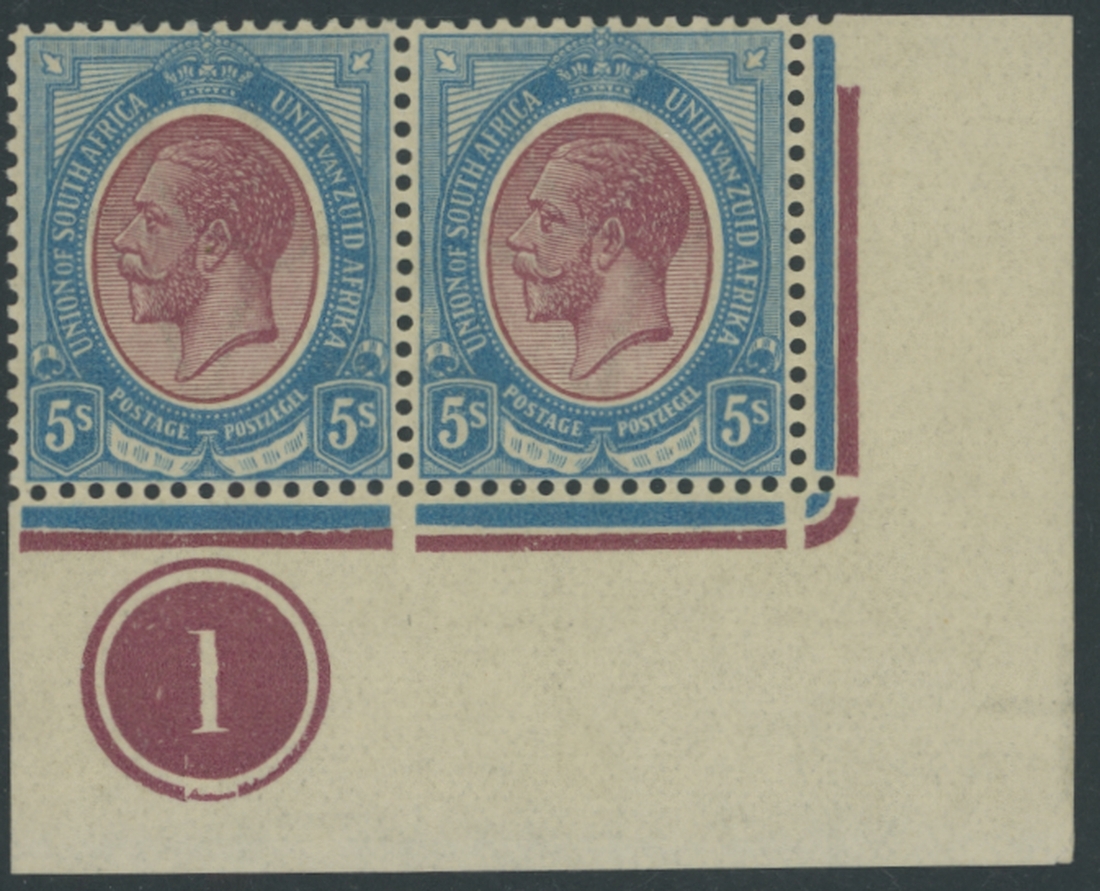 5/- purple and blue, lower-right and left corner plate '1' pairs; fine unmounted mint