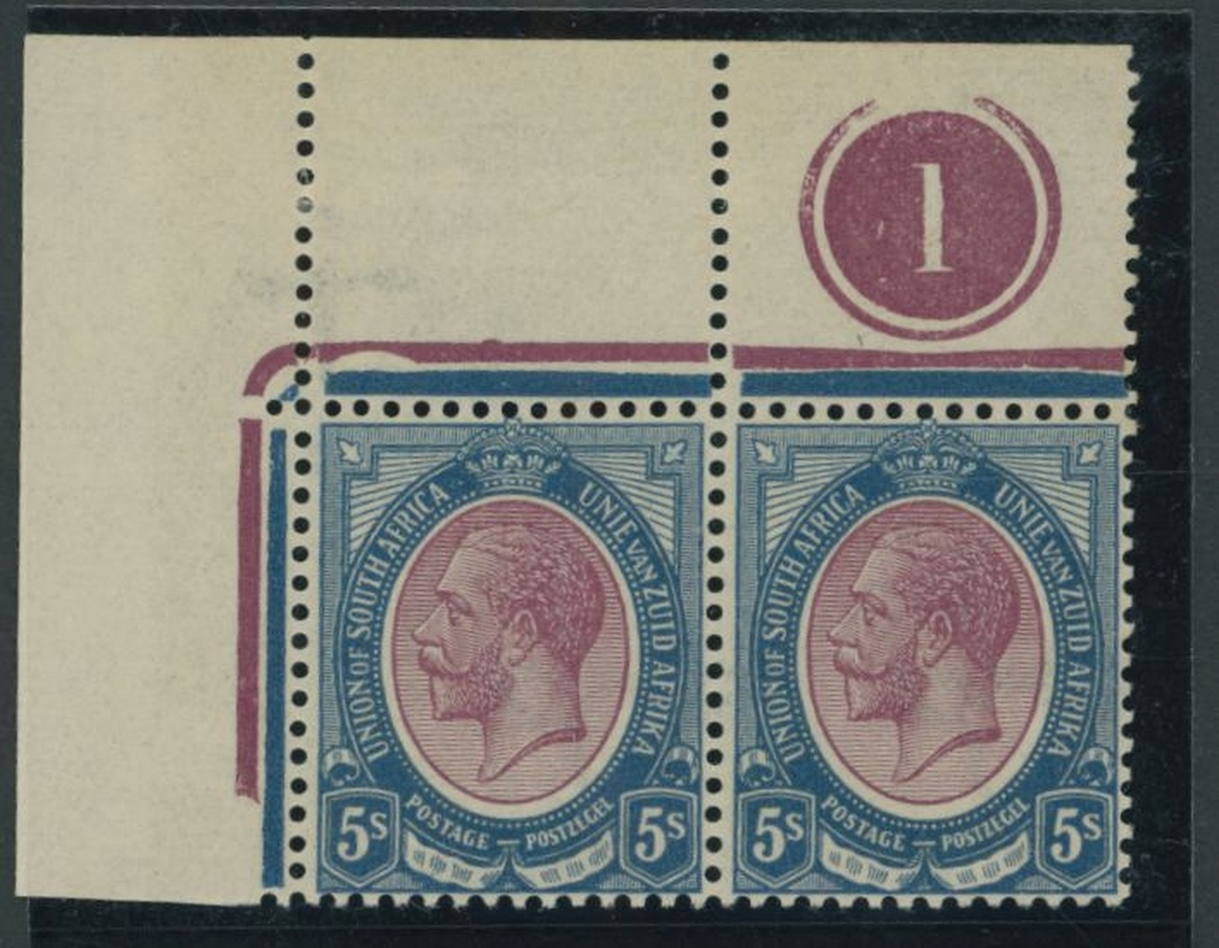 5/- purple and blue, plate '1' corner pair from the upper-left corner; superb unmounted mint. S.G. 15