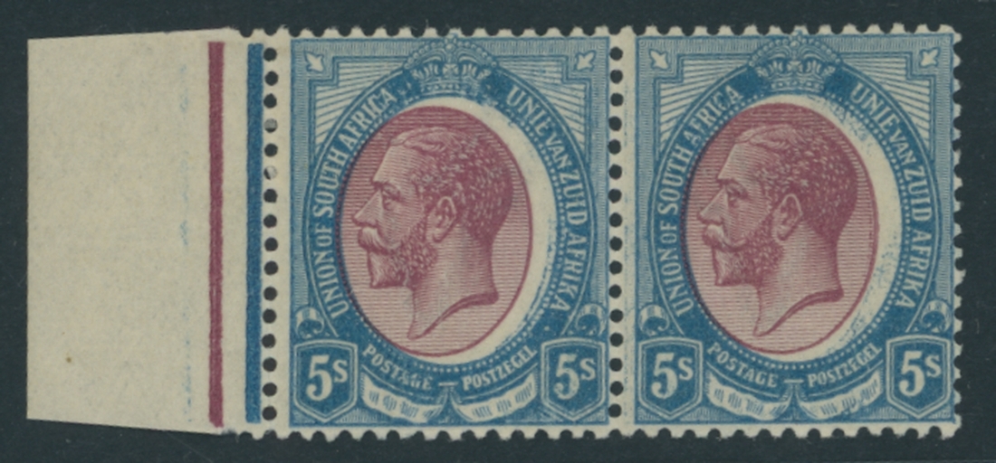 5/- purple and blue, horizontal pair from the left of the sheet variety new moon, as a result of a dramatic shift of the vignette down and left, striking and rare; very fine mint