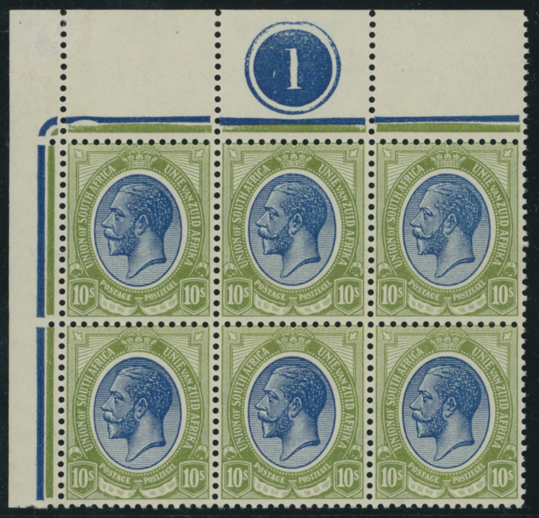 10/- deep blue and olive-green, plate '1' block of six from the upper left corner of the sheet; almost full original gum, superb and very rare. B.P.A. Certificate (2018). S.G. 16