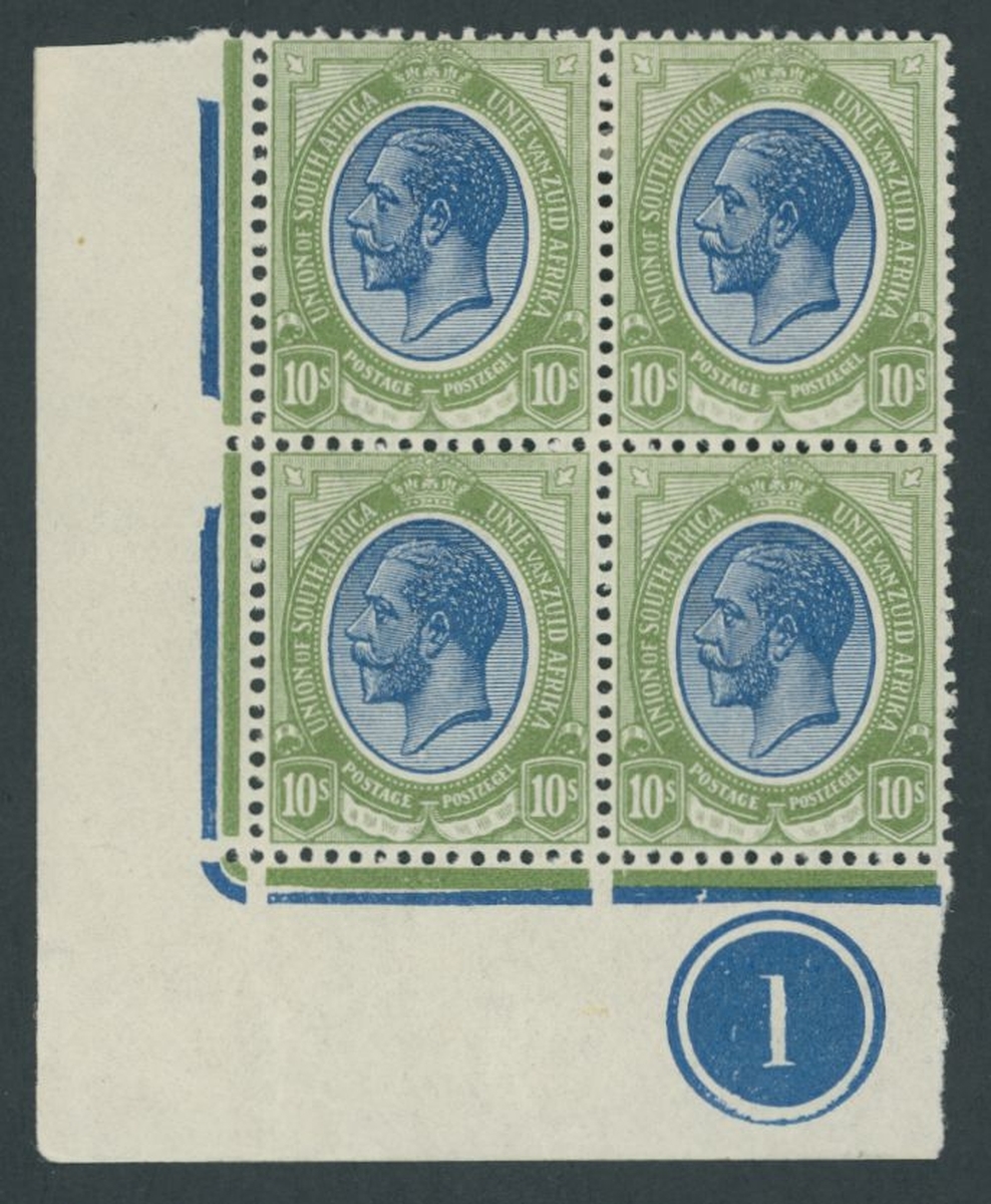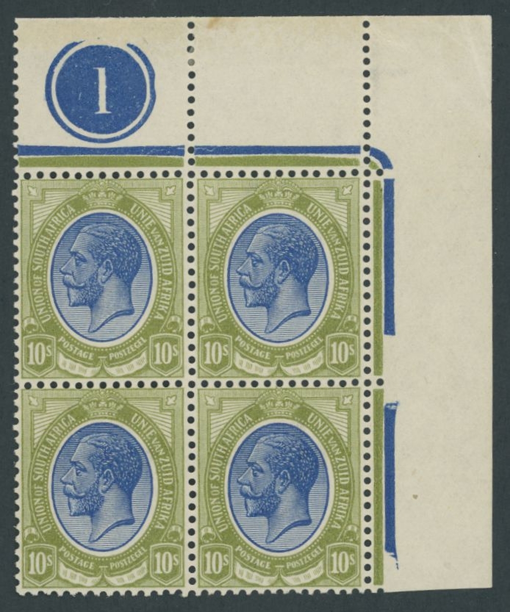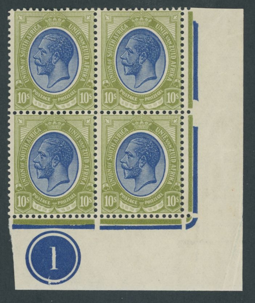 10/- deep blue and olive-green corner plate '1' blocks of four (4), one block from each corner of the sheet; very fine mint and a difficult group to assemble. S.G. 16