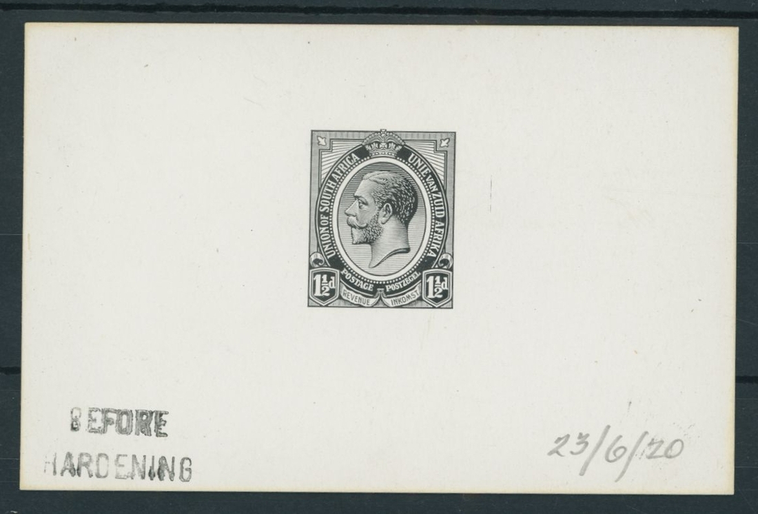 Die proof of the completed design for the 1½d. value in black on white glazed card (82 x 60mm.), marked