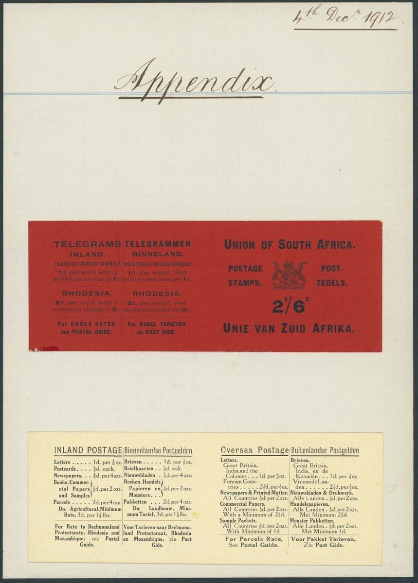 Archival page headed "Appendix" and dated "4th Dec. 1912" with unfolded proofs of 2/6d booklet, front and back in black on red and centre pages in cream affixed below; the first booklet proofs from De la Rue contained numerous errors in the Dutch language and were not approve, but returned for correction; superb and rare