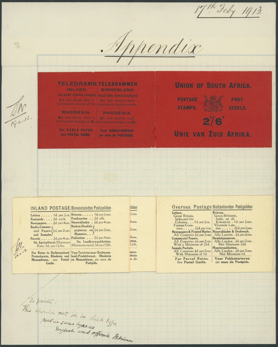 Archival page headed "Appendix" and dated "17th Feb. 1913" with proofs of the front and back pages of the first 2/6d. booklet in black on red (severed), the front initialled and dated "19.2.13", the centre pages in cream affixed below with an additional page added with correction as to type size and annotated "To printer/ This should not be in thick type/ put in same type as English word opposite minimum"; this was approved on 26th February 1913, fine and unique