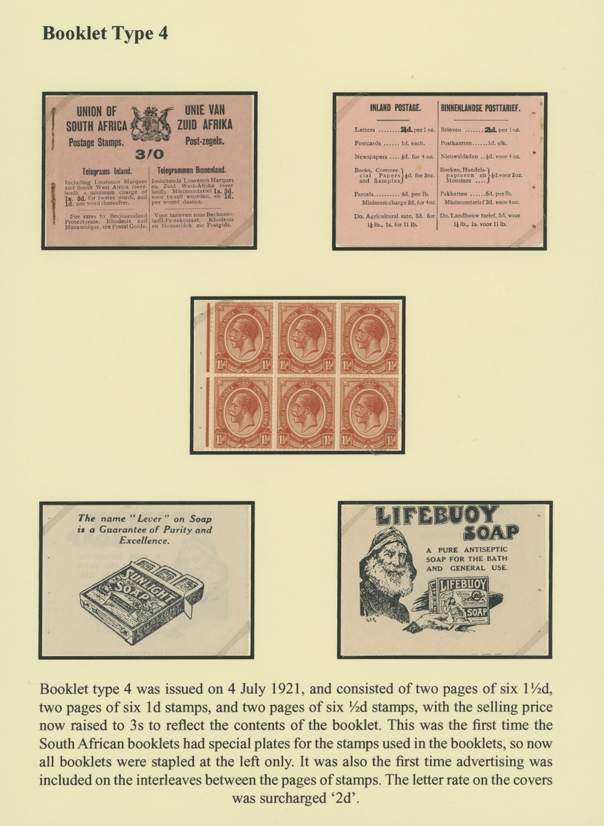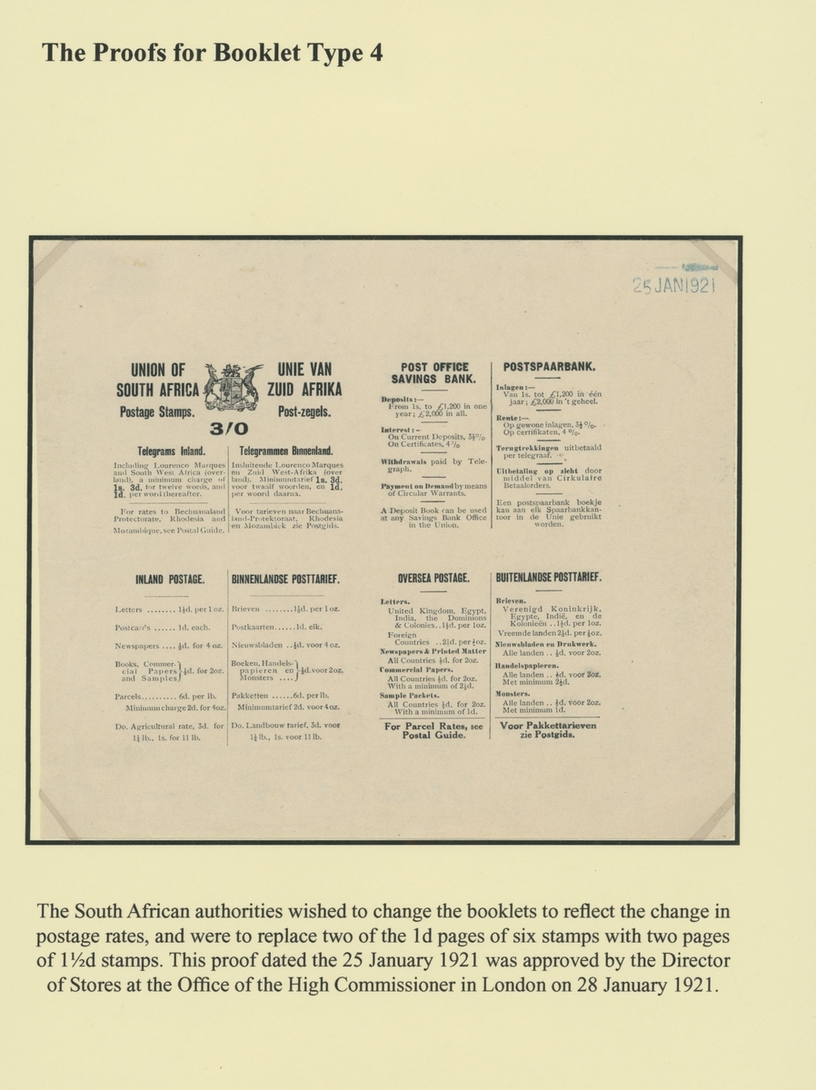 1921 (25 Jan.) unsevered proof of the 3/-booklet in black on buff paper (145 x 170mm.) from the De la Rue archives, dated at upper right corner, fine and very rare; also exploded covers and two advertising panes and a pane of the 1½d. all written up on an exhibition page
