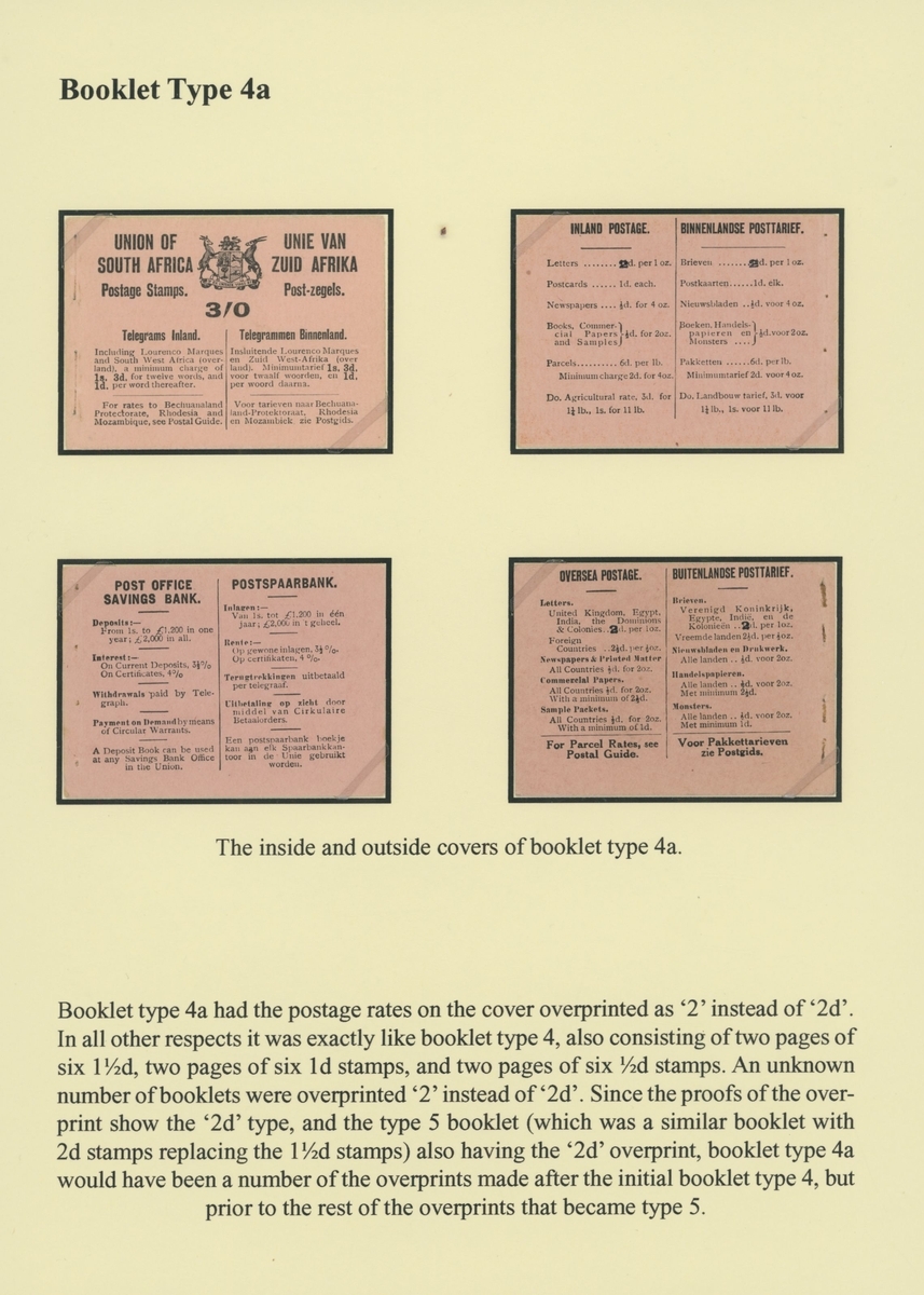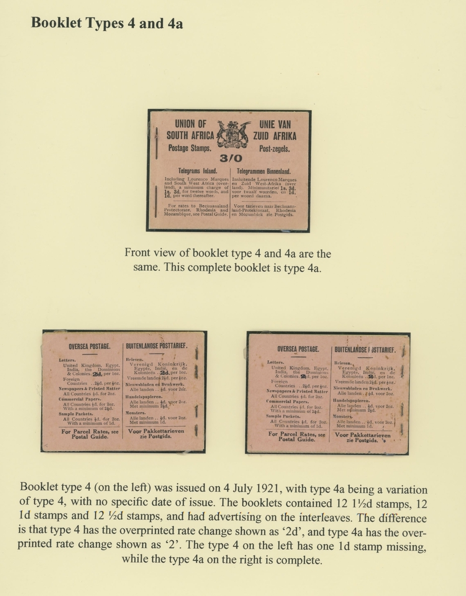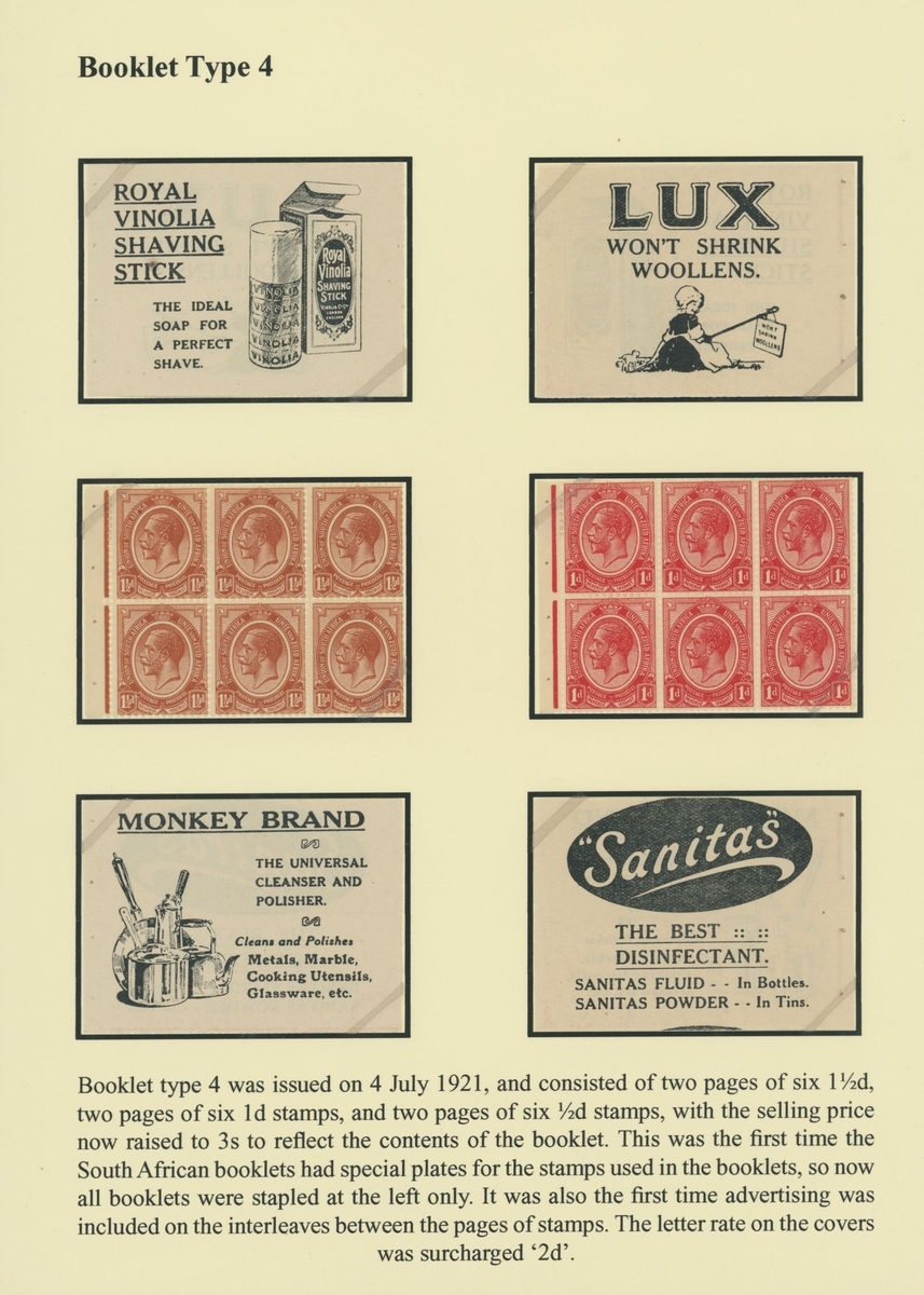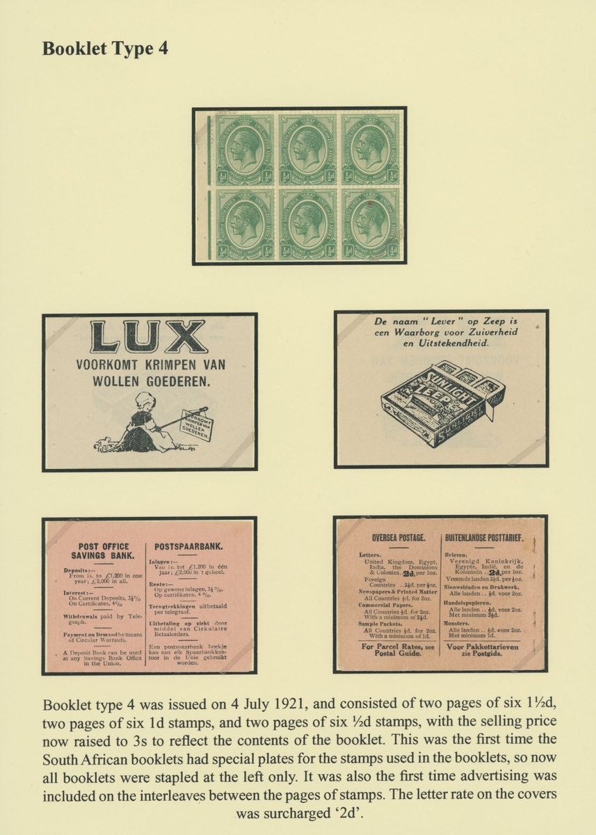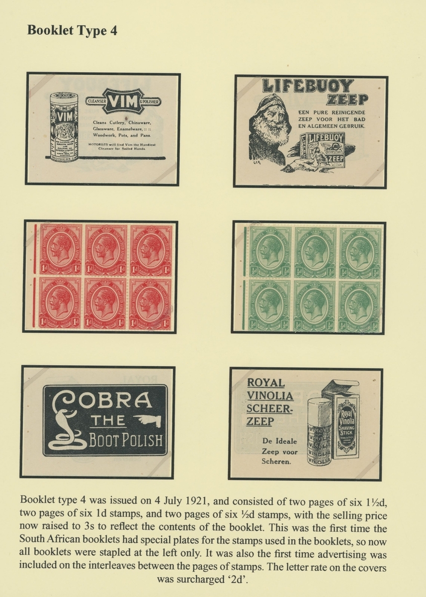1921 3/- in black on salmon-pink cover, a complete booklet with all panes and adverts intact, perforations trimmed a little as usual; also two incomplete booklets with partial panes and exploded booklet covers, Types 4 and 4a, ½d., 1d. (2) and 1½d. complete panes and ten different advert panes all displayed on exhibition pages; a fine group. S.G. SB3 etc.