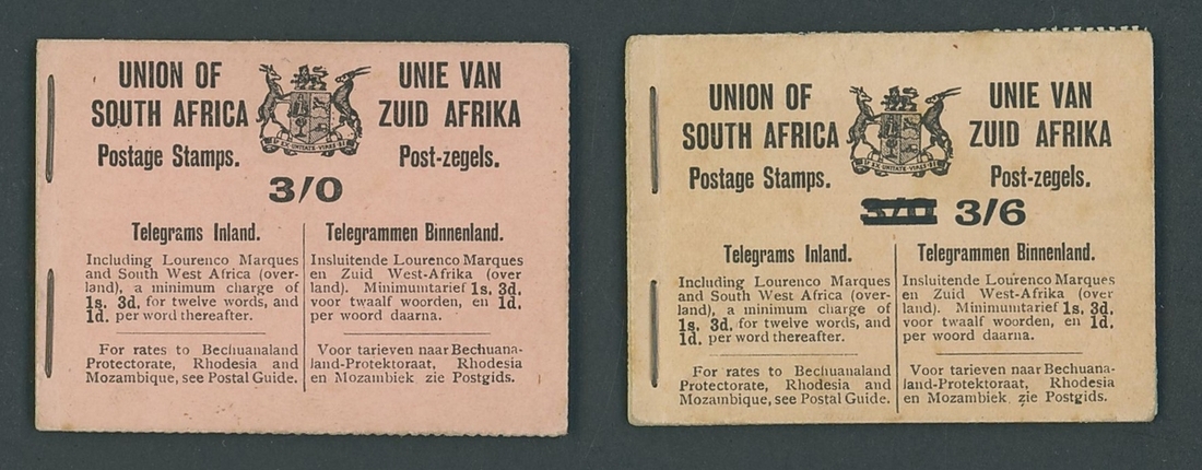 1921 3/- black on salmon-pink cover, stapled at left and 1922 3/6d. on 3/- black on salmon-pink cover, stapled at left; both complete booklets with advertising panes, some light soiling and age marks to the covers only; scarce. S.G. SB3 and SB4, £2,000
