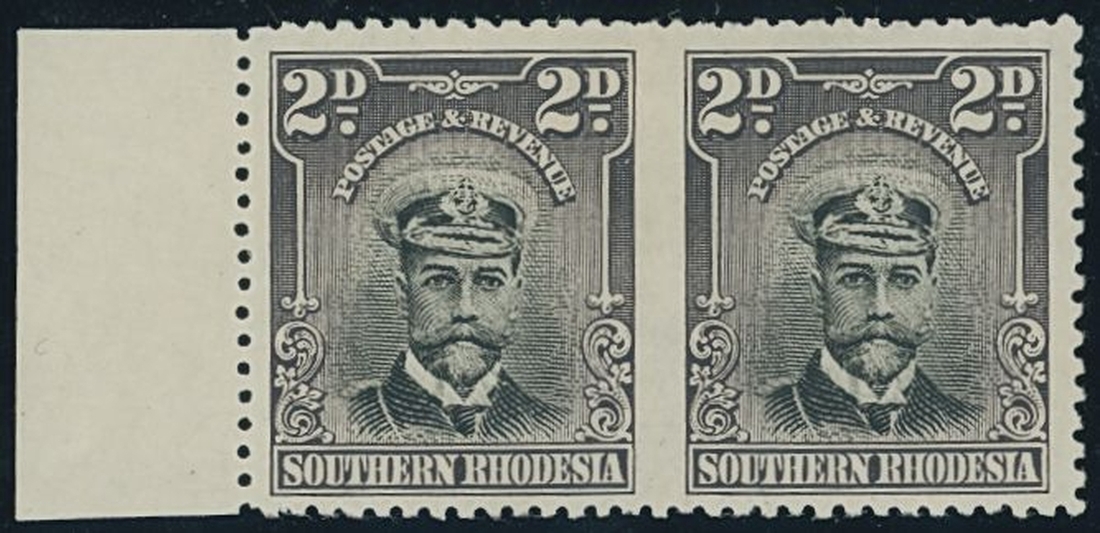 1924-29 2d. black and purple-grey marginal pair from the left of the sheet, noted as close in shade to the 4th. printing (slate purple), variety imperforate between, fine mint and exceptionally rare with only twelve pairs recorded by Peetoom with a third sheet possible believed to have existed. R.P.S. Certificate (1934). S.G. 4a, £17,000
