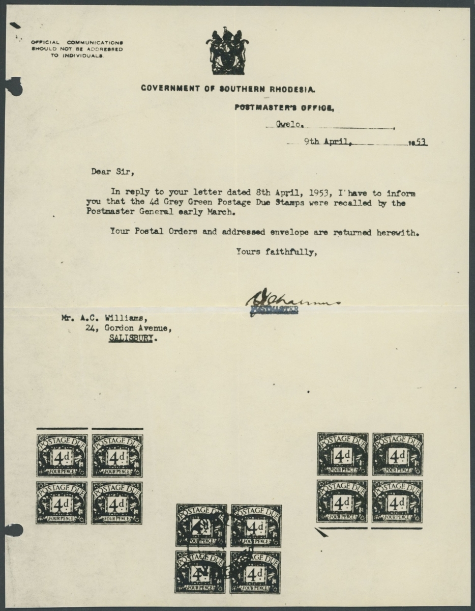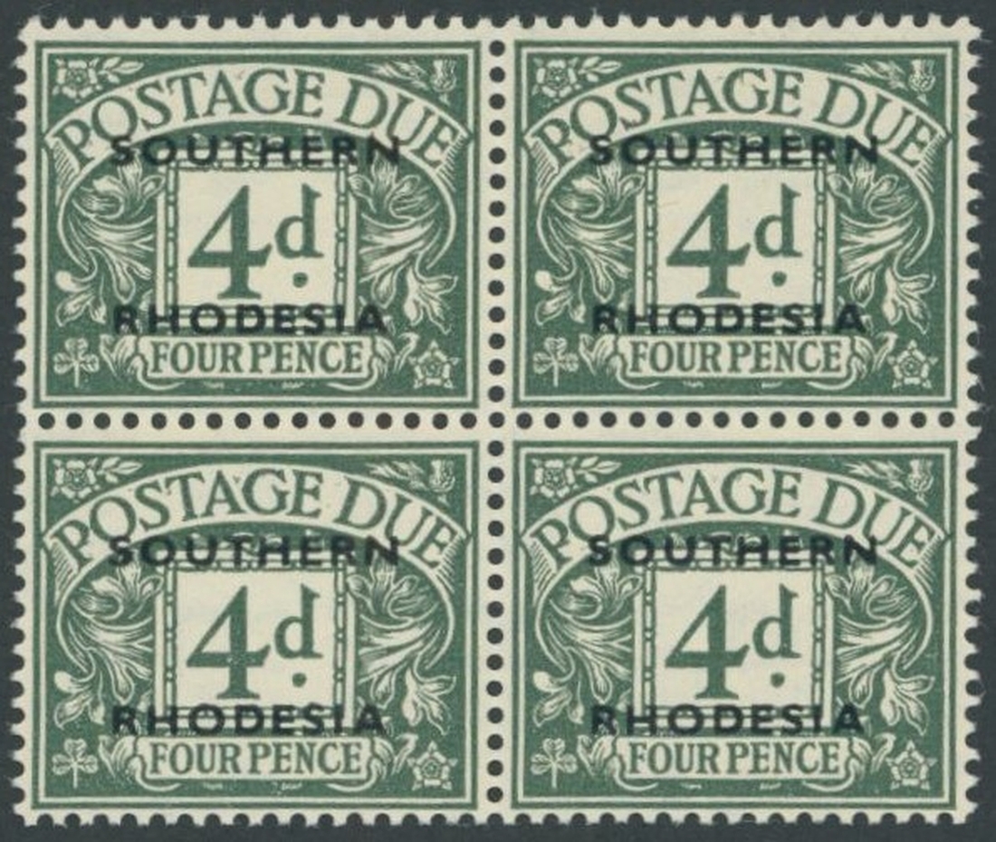 1951 4d. error of colour, dull grey-green, a block of four; superb unmounted mint, a rare multiple; offered with copies of the Government letters recalling this printing. S.G. D6, £1,200