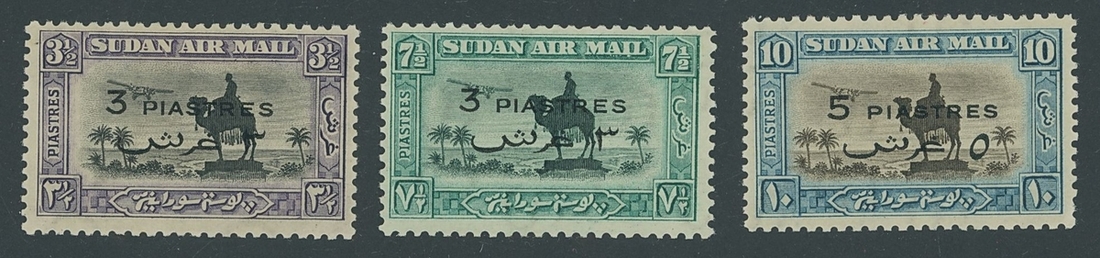 1938 Air 3pi. on 3½pi black and violet, 3pi. on 7½pi. green and emerald and 5pi. on 10pi. brown and greenish blue, all variety perforated 11½ x 12½, fine mint. Signed Kessler and with Peter Holcombe Certificate (1991). S.G. 75a, 76b and 77b, £2,250