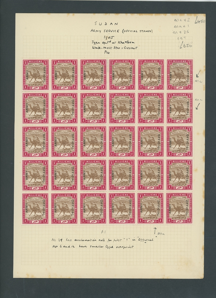1905 1m. brown and carmine, a block of thirty, the last two pairs in the upper two rows showing Types A1 and A2 se-tenant ad the bottom row, the second to last stamp variety '!' for