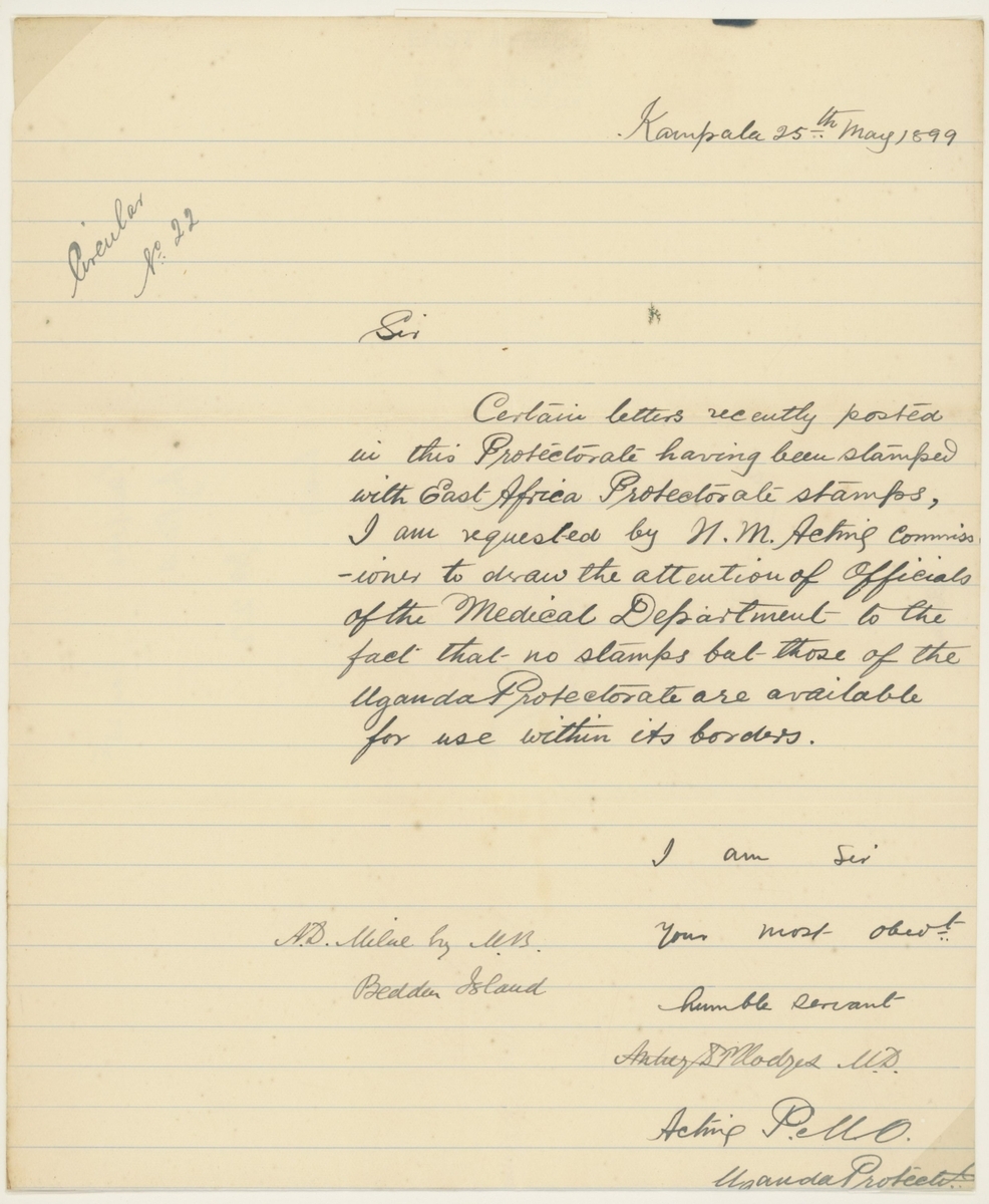 1899 (25 May) letter headed "Kampala", marked Circular No. 22, addressed to Dr. Milne at Bedden Island (Fort Berkely), from Acting P.M.O., Uganda Protectorate, pointing out "Certain letters recently posted in this Protectorate having been stamped with East Africa Protectorate stamps, I am requested by H.M. Acting Commissioner to draw the attention of Officials of the Medical Department to the fact that no stamps but those of the Uganda Protectorate are available for use within its borders"