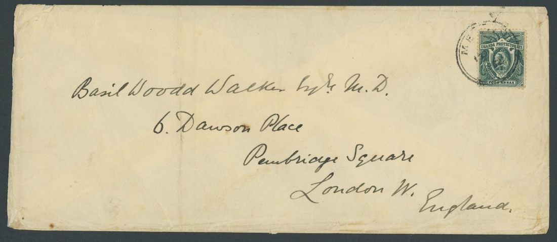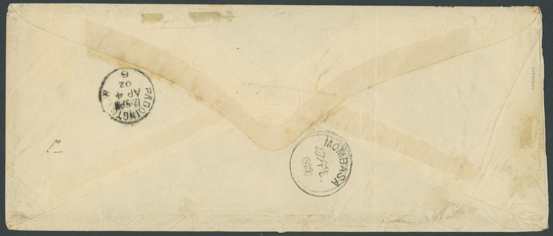 1902 (17 Feb.) envelope (225x93mm.; peripheral creases) from Archdeacon Walker at Mengo to England, bearing 1898 4a. tied by