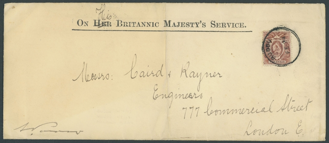 Note: F. Pordage was not one of the seven officers entitled to frank OHMS mail; originally, the Buddu c.d.s. was applied direct to the cover, but then a postage stamp to cover the double rate to England was affixed and the datestamp struck again to cancel the adhesive.