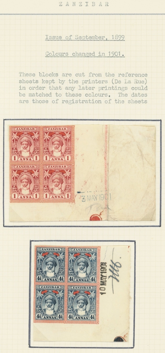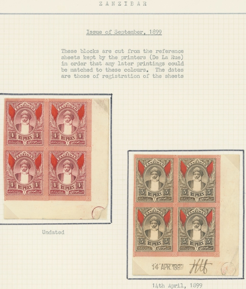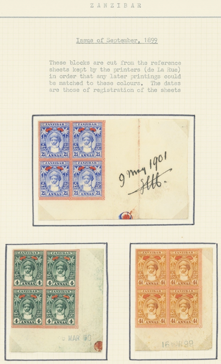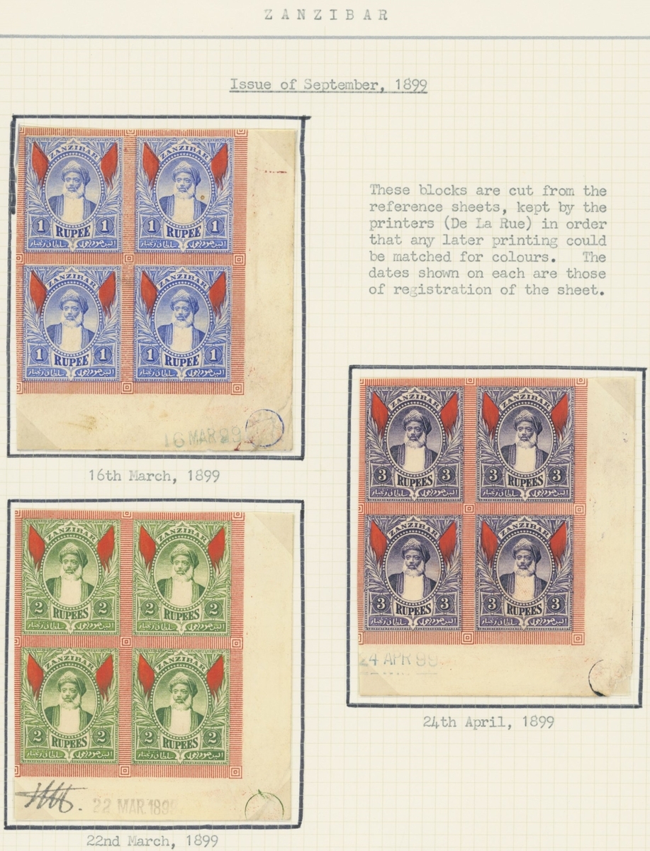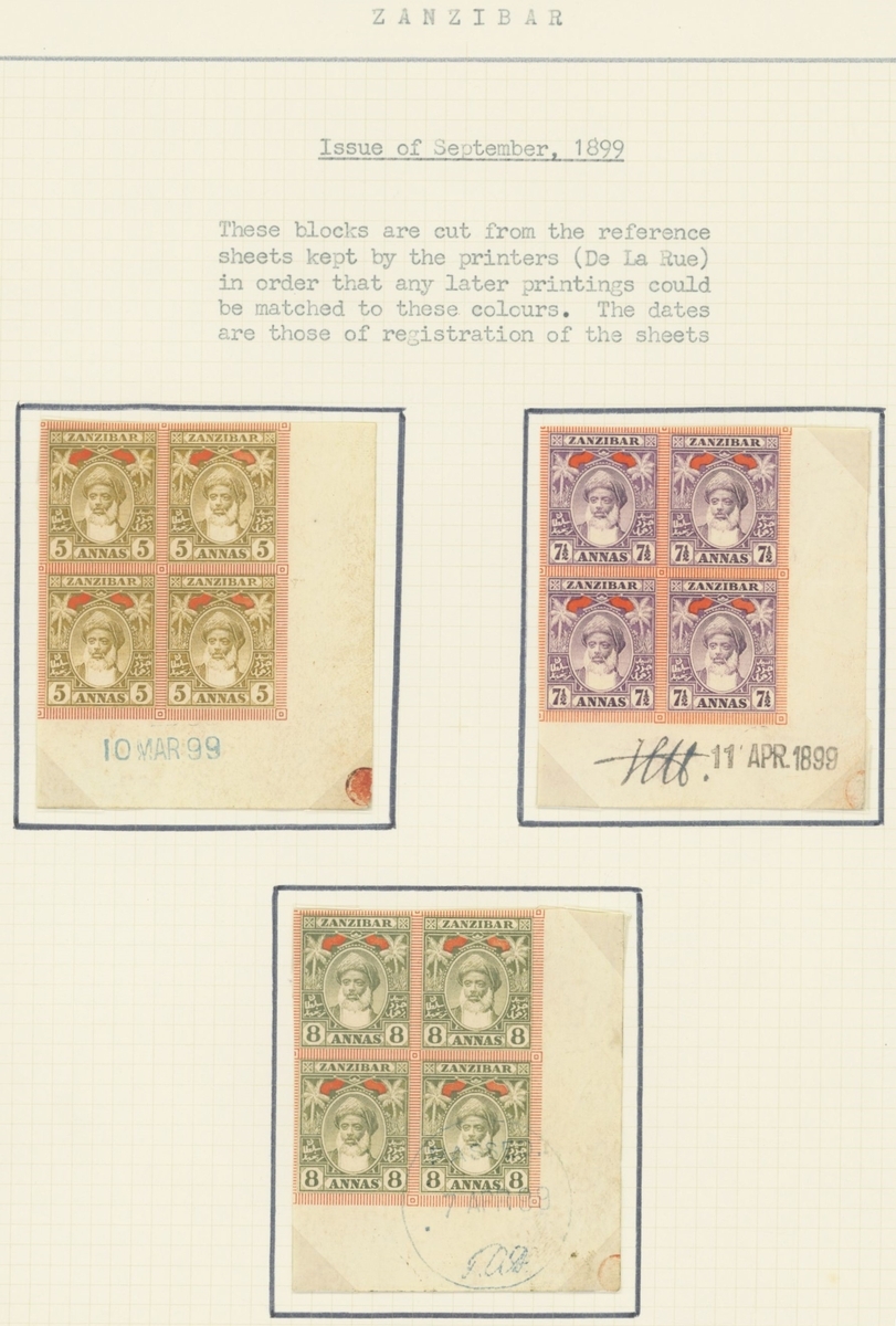 1899-1901 1a. to 5r. set of seventeen, each value in a corner imperforate plate proof block of four on ungummed watermarked paper, all cut from the De la Rue reference sheets, each corner block with registration date stamped in the corner, some are initialled; These blocks were kept so that later printings could be matched to these colours; superb and unique