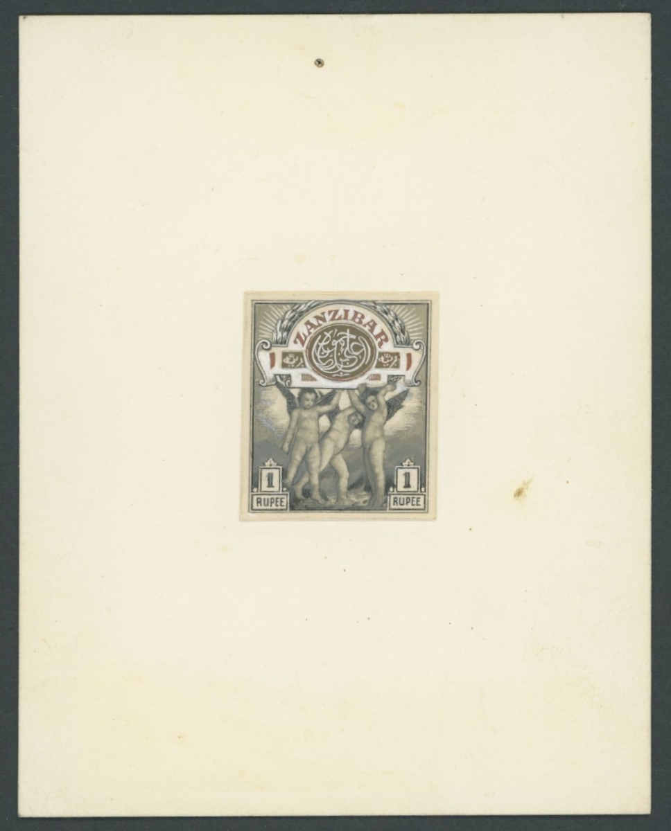 1906 1r. unadopted composite essay for a 1r. stamp, the photographic essay with Sultan's monogram hand painted and separately applied, the surrounding area handpainted in Chinese white, the value tablets and other background details handpainted in black and Chinese white, the essay applied to thick card, (89 x 113mm.). A unique essay from the De La Rue archives, very fine
