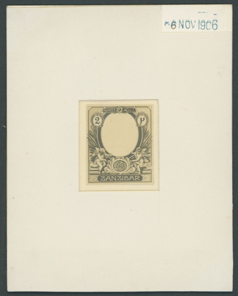 1906 2r. photographic essay of an unadopted frame design in sepia on cream paper mounted on card, with non-contemporary white card overlay (90 x 115mm.), dated