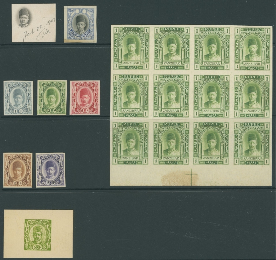 1907 group of proof items (8) comprising Sultan Ali bin Hamoud small vignette proof printed in brown on thin glazed card, dated "Feb. 22 1907" and initialled (30 x 27mm.), 1907 cents issue Master Die Proof with undenominated value tablets, the central vignette in black and the frame in ultramarine, guide marks at the corners, reverse dated "7 Oct 1907" (22 x 26 mm.), 1c. to 12c. set of five imperforate plate proofs in the issued colours (5) and 1r. yellow-green imperforate plate proof block of twelve from the foot of the sheet with printer's guide mark at foot; also a 1908 'forgery die proof' of the 3c. value in yellow-green; a lovely group, rare