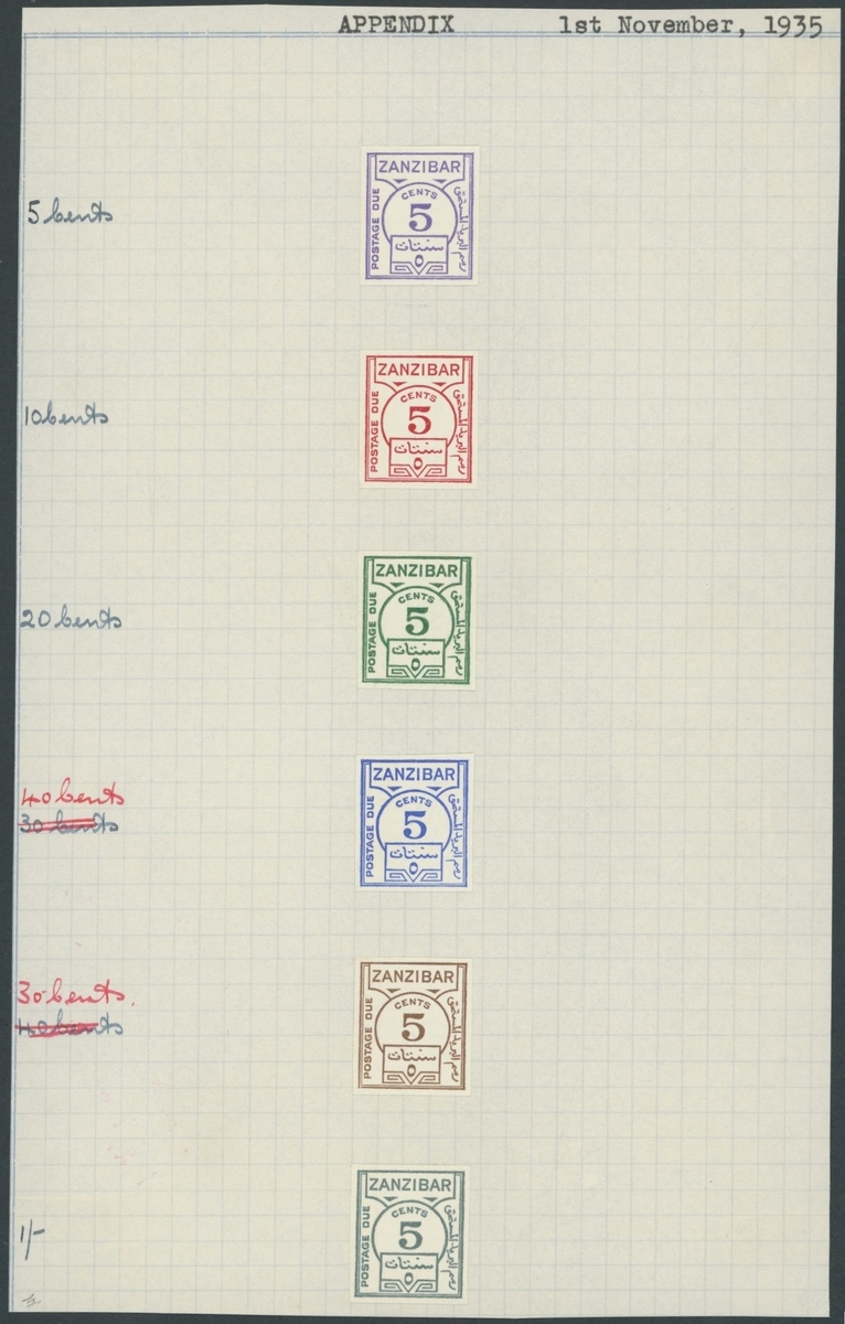 1935 (1 Nov.) Appendix sheet bearing the 1935 5c. colour trials (6) in violet, scarlet, green, blue, brown and grey and with manuscript annotations alongside each showing the chosen colour for each denomination; very fine and a unique appendix page from the De La Rue archives