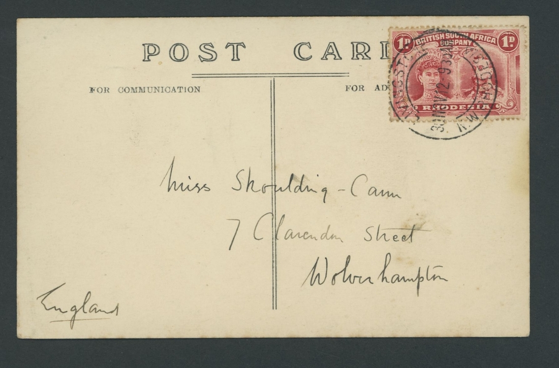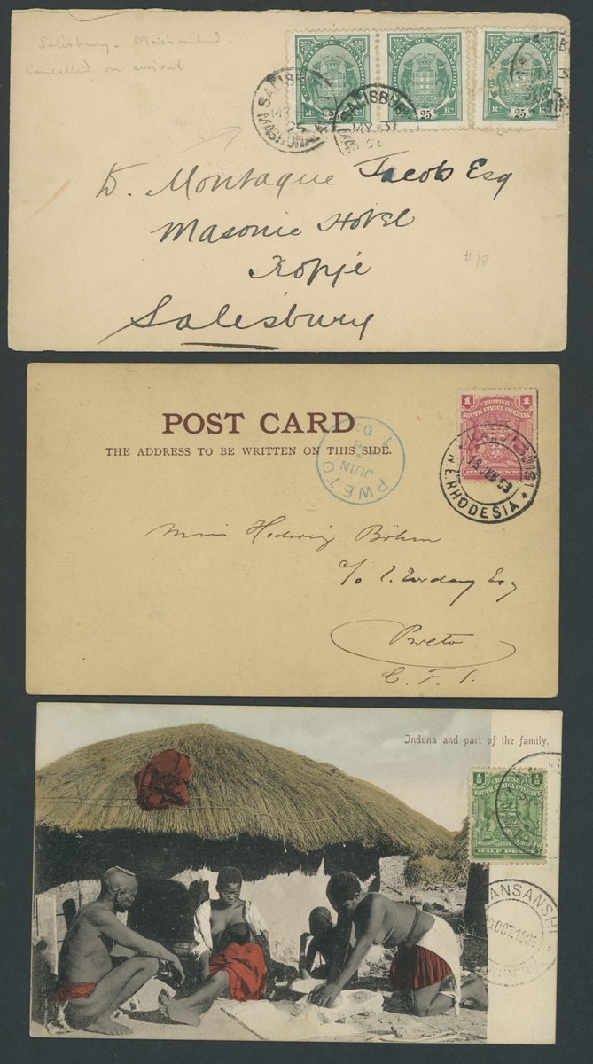 1895 envelope from Beira to Kopje, Salisbury bearing Mozambique Company 25r. (3) cancelled on arrival with Salisbury c.d.s. (31.5), the reverse with Umtali transit d.s.; 1903 (13 June) picture postcard to OFS bearing 1898 1d. tied by