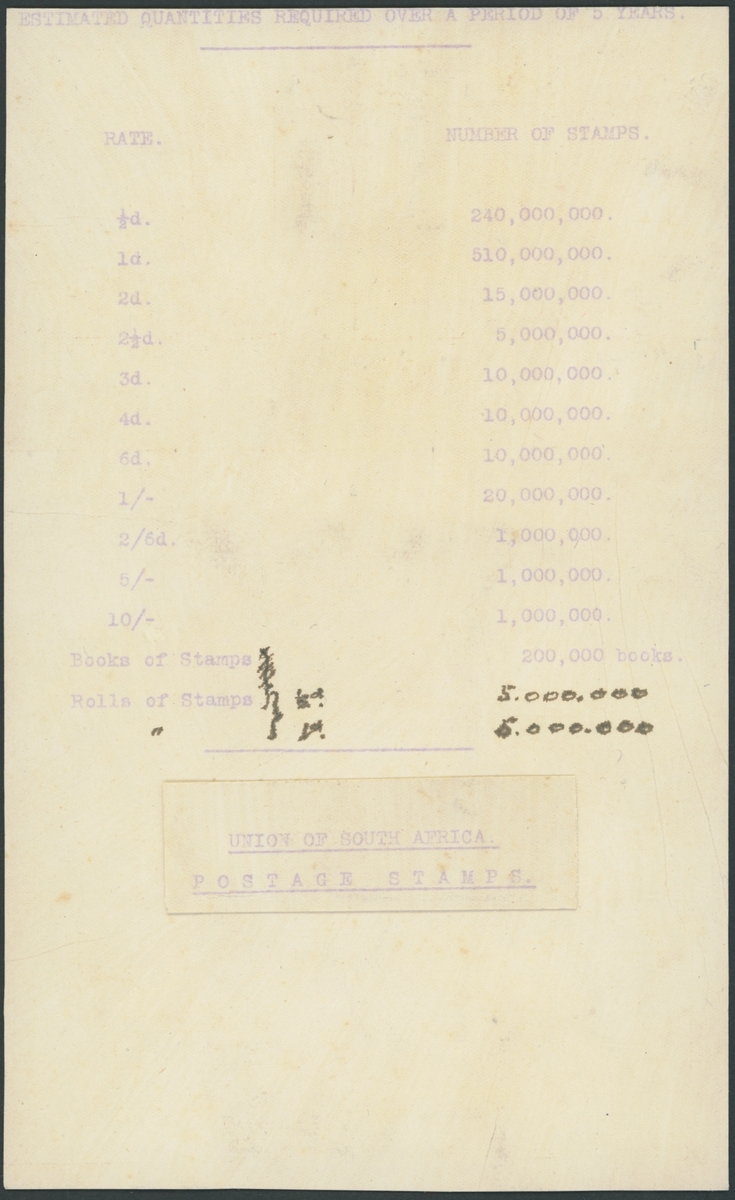 This shows that the Mackay Essays were seriously considered for use as the First Union Definitives and that the Springbok Head Watermark was already conceived in 1911/12; fine and very rare