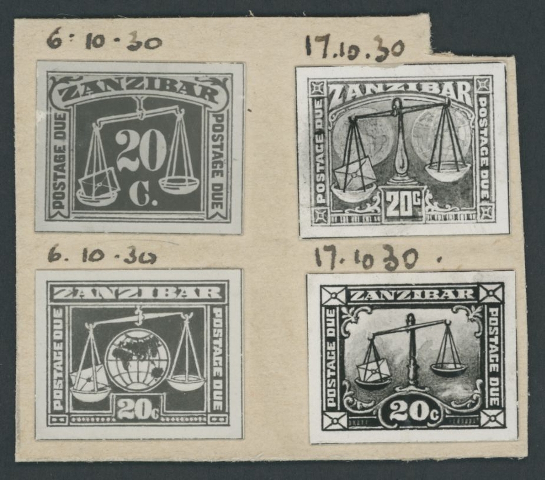 1930 (Oct.) a group of four stamp-sized bromides of different hand-painted essays based on the 1923 Hong Kong 'Postal Scales' design (at the suggestion of the Zanzibar authorities), each denominated