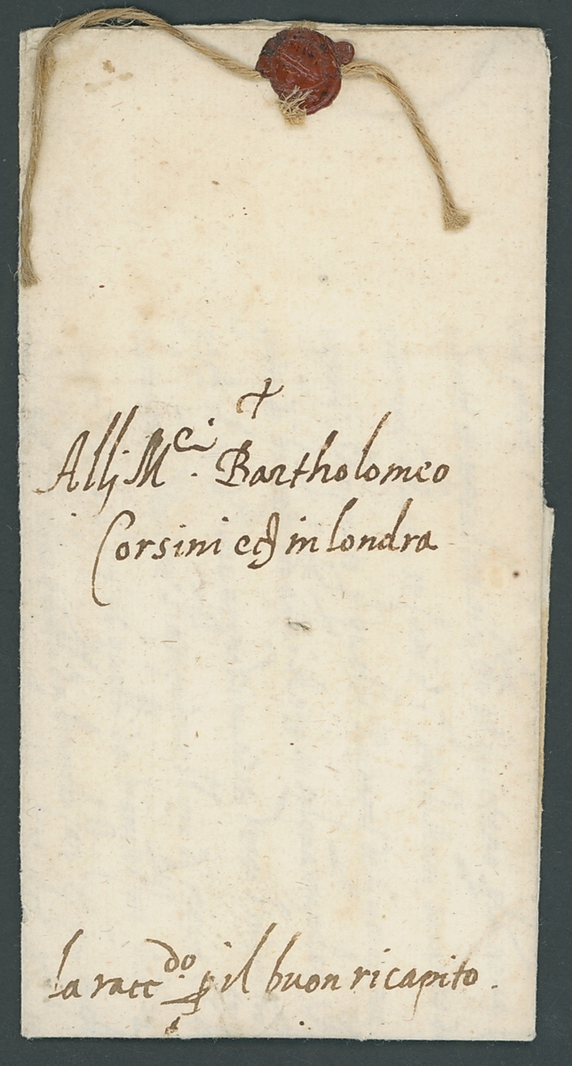 1588 (4 Aug.) entire letter from Augusta to Bartholomew Corsini in London, endorsed "La racc-do. p il buon recapito", contents make reference to "...the Catholic Army at Augsburg would be returning home which could be good for business". Complete with wax seal and original tie, unusual as such. 'La Raccomandata' endorsements such as this are very rare.
