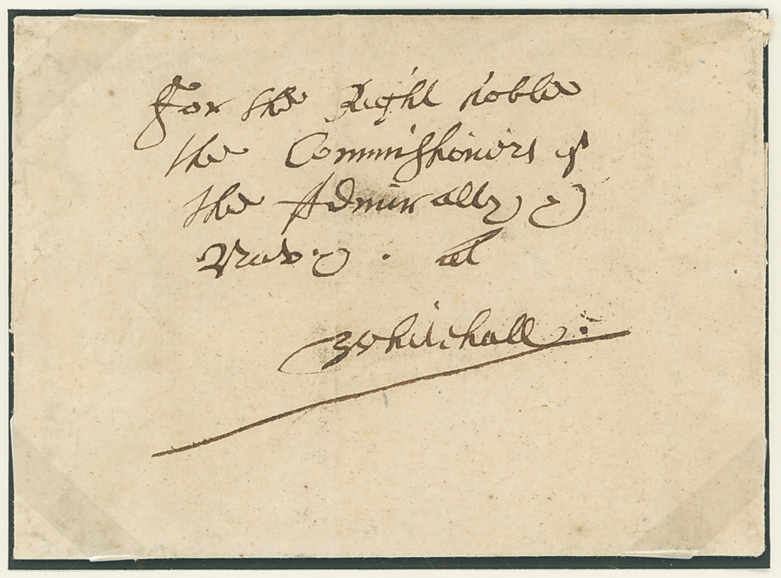 1654 (17 Feb.) entire letter from Dr. Walter Walker, "D[octo]r's Commons" in London with address panel reading "For the Right Noble, the Commissioners of the Admiralty and Navy at Whitehall", without postal markings so likely carried privately, contents include "I have prepared a draft opinion(?) about the seized Danish ships and humbly submit it to you". A rare early document.