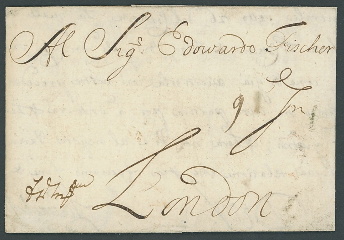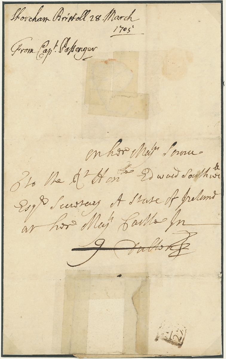 1705 (28 March) entire letter from Captain Passenger of H.M.S. 'Shoreham' with address panel reading "To the Rt Hon Edward Southwell Esq Secretary of State of Ireland at his castle in Dublin", endorsed "On Her Majesty's Service", charged "9" in error, and deleted as the addressee was entitled to Free Mail; the reverse struck with Bristol Bishop "