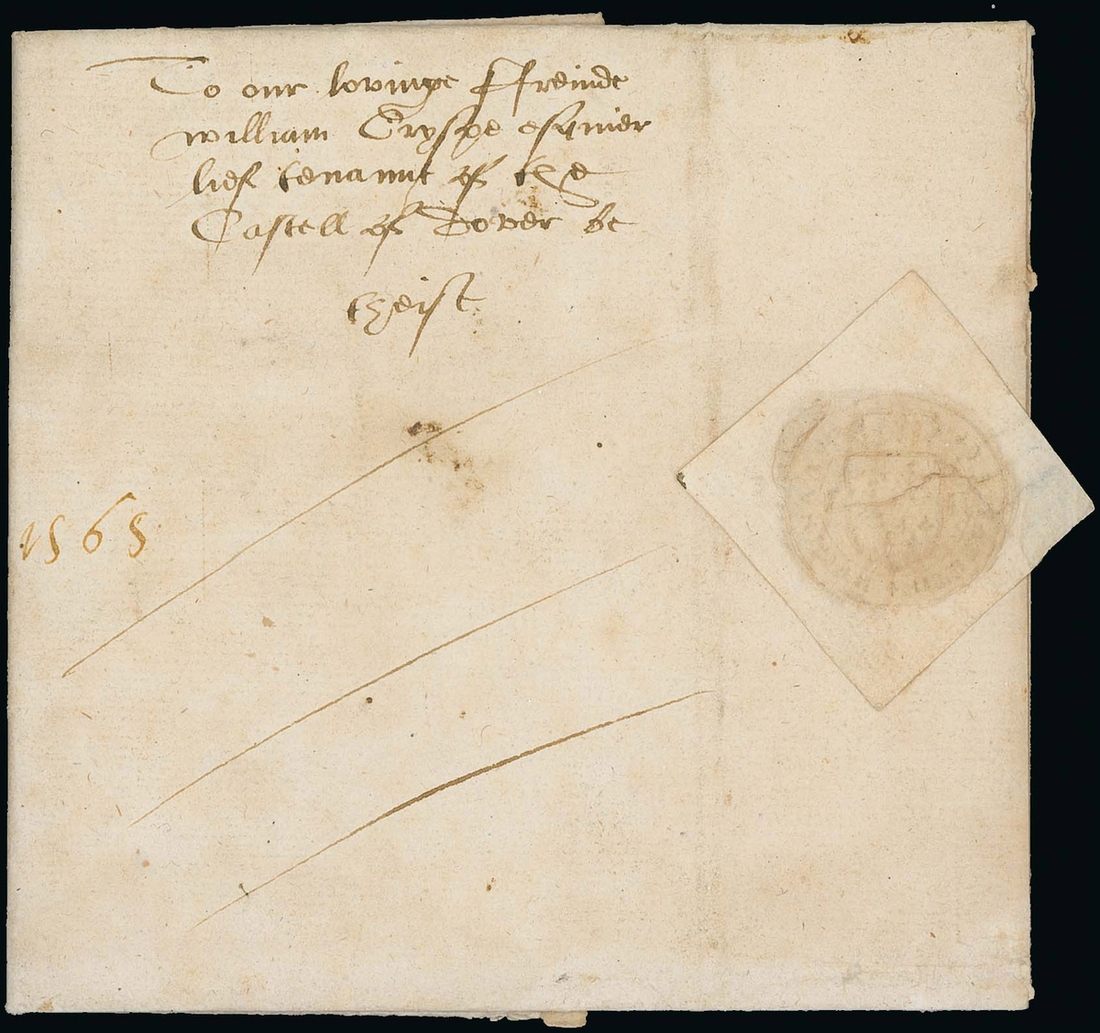 1565 (3 April) entire letter with wafer seal and address panel reading "To our loving ffriende, William Crysoe Esquire, Lieftenant of the, Castell of Dover be, theist", sending a warrant for summoning juries for searching premises with regards defects in the collection of customs and illegal exports, enquiring "whether any wares merchandise be now carried out of this realme into the porte beyonde the seas, contrarye to the Lawes and statutes of our Soveraign Ladie", signed "Thomas Wotton", Sheriff of Kent. Fine and most unusual