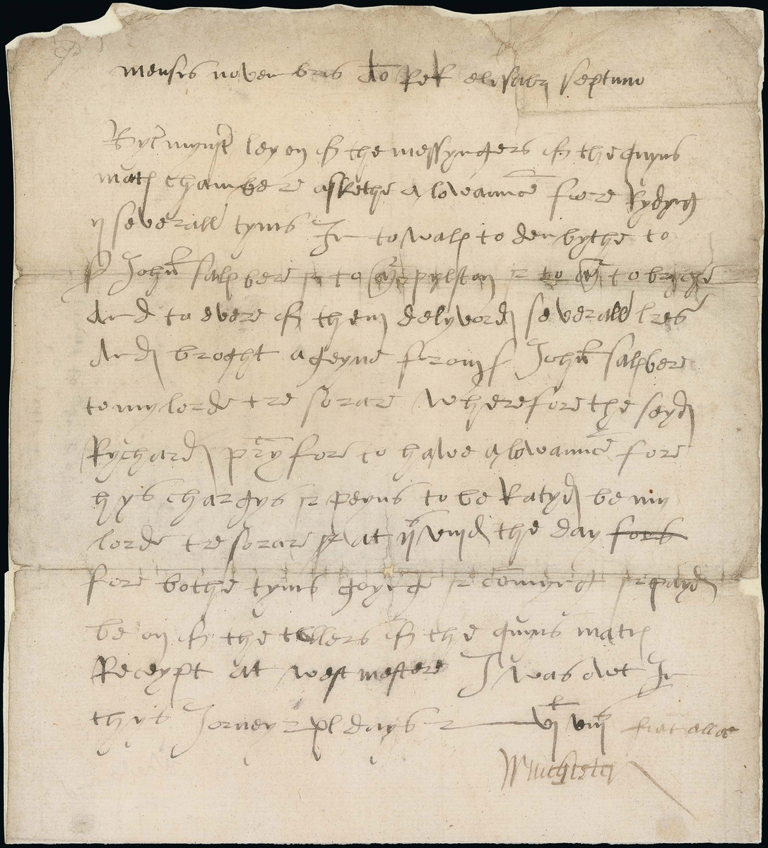 1565 (November) Exchequer warrant to Richard Mynsterley, a Queen's messenger for riding several times into Wales, signed "Winchester", Lord High Treasurer, laid on card though leaving the address panel on reverse remaining visible. This is thought to be the earliest known document with mention of carriage of mail to Wales. A letter of historical and postal significance.