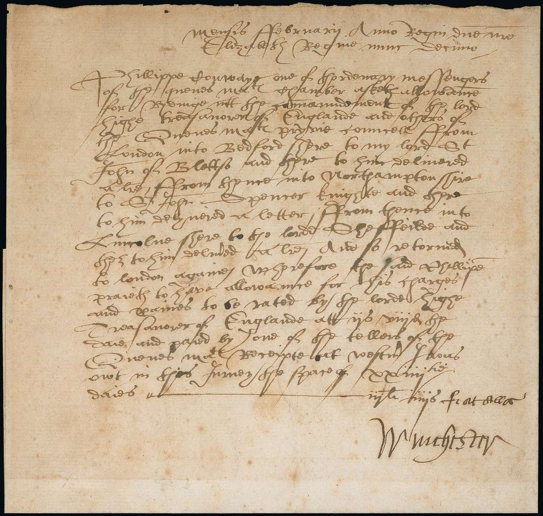 1568 order for the payment of Philip Conway "One of the ordenary of the Quenes Maties'" for carrying a letter from London into Bedfordshire to "my Lord St. John of Bletsoe", then to Northamptonshire to Sir John Spencer, and from there delivering a letter into Lincolnshire to Lord Sheffield, stating the cost of delivery at 2/8d. a day over a twenty-four day period which will be borne by Sir William Killigrew, Groom of the Prviy Chamber to Queen Elizabeth. Letter paper fine, with non-contemporary inscription on reverse alongside contemporary address panel. A rare and particularly early Royal Messenger order.