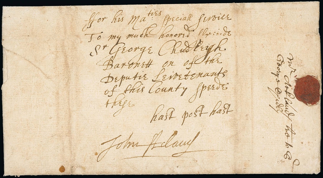 The letter concerns letters from the Lords, with mention of Sir Edward Seymour, requesting that Chudleigh and the "Head Constables of yr & Collonell Bampfields ... to attend us  the shall be present on friday next att the new Inn att Exeter to give us an account how much Conduct and Coate money is allreadie received and in what forwardness the rest is to bee raysed". Signed "John Acland".  Fine, folding out well for display with intact wax seal of the Acland crest; a dramatic endorsement, and rare, this having been sent Cross Post, as evidenced by the lack of endorsements through London.